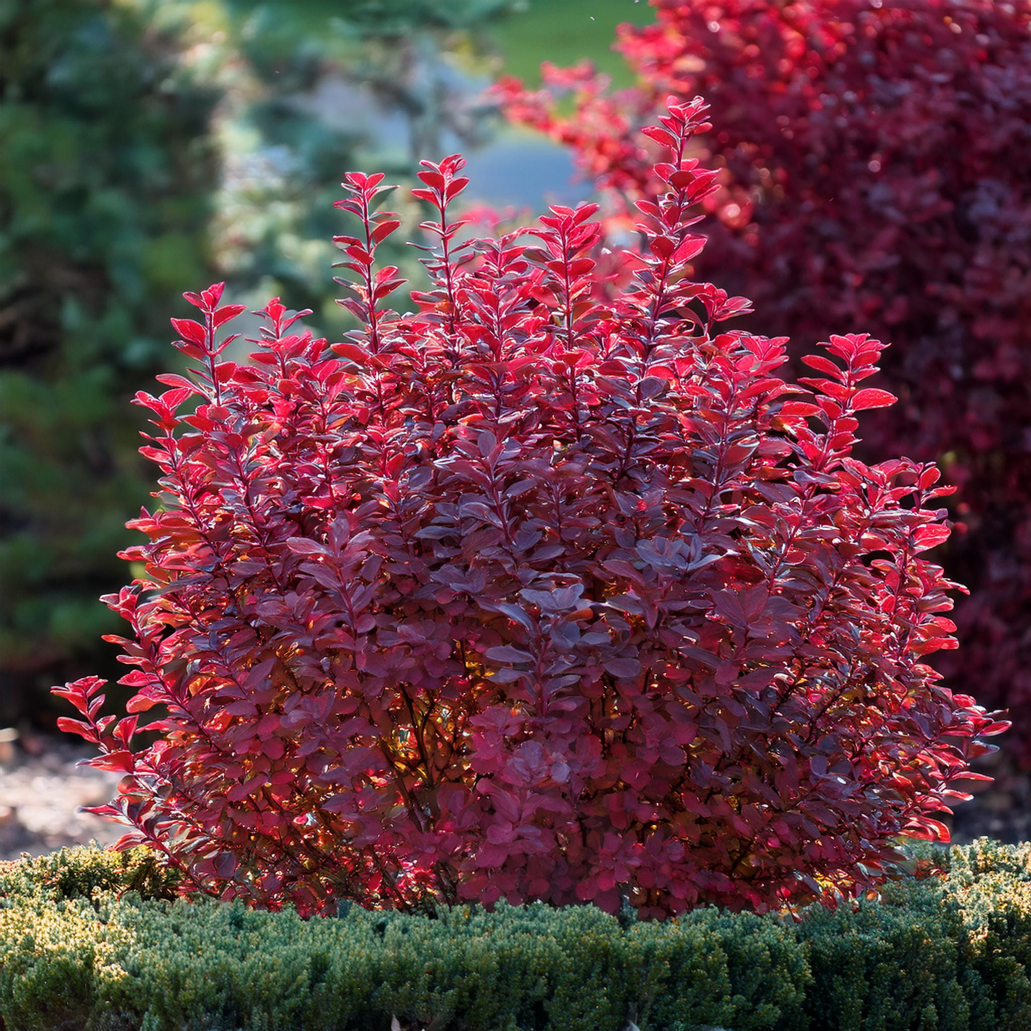 Berberys Thunberga ‘Carlo’ (Berberis thunbergii) to karłowa odmiana berberysu o zwartym, kulistym pokroju, która dorasta do około 30–40 cm wysokości i podobnej szerokości. Jej największą ozdobą są ciemnoczerwone z zieloną obwódką liście, które wiosną i latem nadają roślinie świeży, promienny wygląd. Dzięki swoim niewielkim rozmiarom ‘Carlo’ idealnie nadaje się do mniejszych ogrodów, na skalniaki, a także do pojemników na balkonach i tarasach. Wiosną krzew zakwita drobnymi, jasnożółtymi kwiatami, a jesienią zdobią go czerwone owoce, które przyciągają ptaki. Berberys to urocza roślina, która wnosi radość i barwę do każdego ogrodu, a jednocześnie jest bardzo łatwa w pielęgnacji. To doskonały wybór dla tych, którzy szukają niewielkiej, ale efektownej ozdoby na każdą przestrzeń.