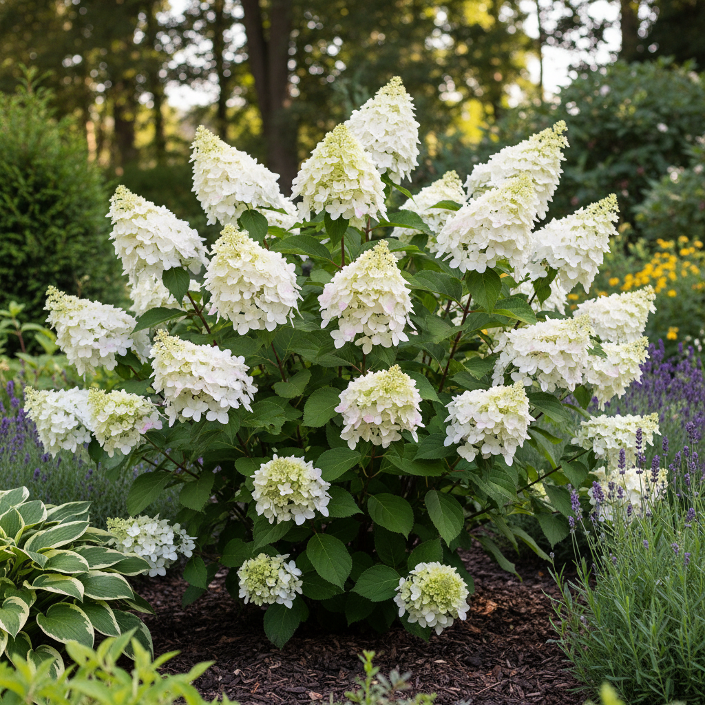 Hortensja bukietowa ‘Confetti’ (Hydrangea paniculata) to kompaktowa odmiana hortensji, wyróżniająca się delikatnymi, wiechowatymi kwiatostanami o subtelnych, zmieniających się barwach. Dorasta do 1–1,2 m wysokości, tworząc gęsty, zaokrąglony krzew. Jej kwiaty początkowo są kremowobiałe, następnie stopniowo nabierają różowych i białych odcieni, co sprawia, że roślina wygląda niezwykle lekko i elegancko. Kwitnie od lipca do września, zachwycając swoim urokiem przez całe lato. Doskonale komponuje się z innymi hortensjami, trawami ozdobnymi i niskimi iglakami, tworząc eleganckie i harmonijne kompozycje. Dzięki swojemu zwartemu pokrojowi i delikatnym kwiatom ‘Confetti’ to idealna hortensja do mniejszych ogrodów i donic.