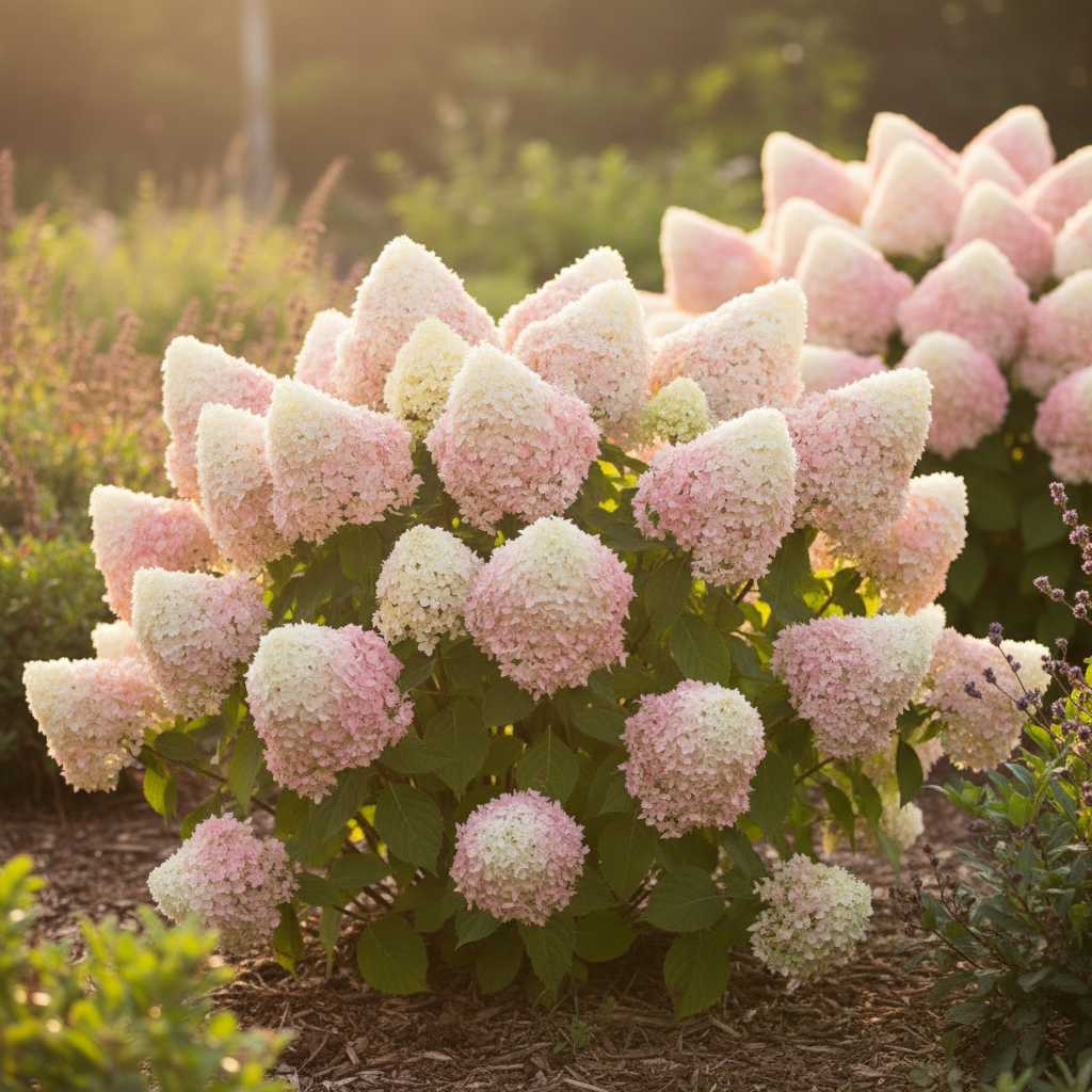 Hortensja bukietowa ‘Sweet Summer’ (Hydrangea paniculata) to kompaktowa i niezwykle dekoracyjna odmiana, ceniona za obfite, długie kwitnienie i efektowną zmianę barwy kwiatostanów. Krzew dorasta do 1,2–1,5 m wysokości, tworząc gęsty, regularny pokrój. Jej duże, stożkowate kwiatostany początkowo są kremowobiałe, następnie stopniowo przechodzą w subtelny róż, nadając roślinie romantyczny charakter. Kwitnie obficie od lipca do października, zdobiąc ogród przez całe lato i jesień. Świetnie komponuje się z innymi hortensjami, trawami ozdobnymi oraz niskimi krzewami liściastymi, tworząc harmonijne i eleganckie aranżacje. Dzięki długiemu kwitnieniu i pięknemu przebarwianiu się kwiatów ‘Sweet Summer’ to doskonały wybór dla osób poszukujących niezawodnej i efektownej rośliny do ogrodu.