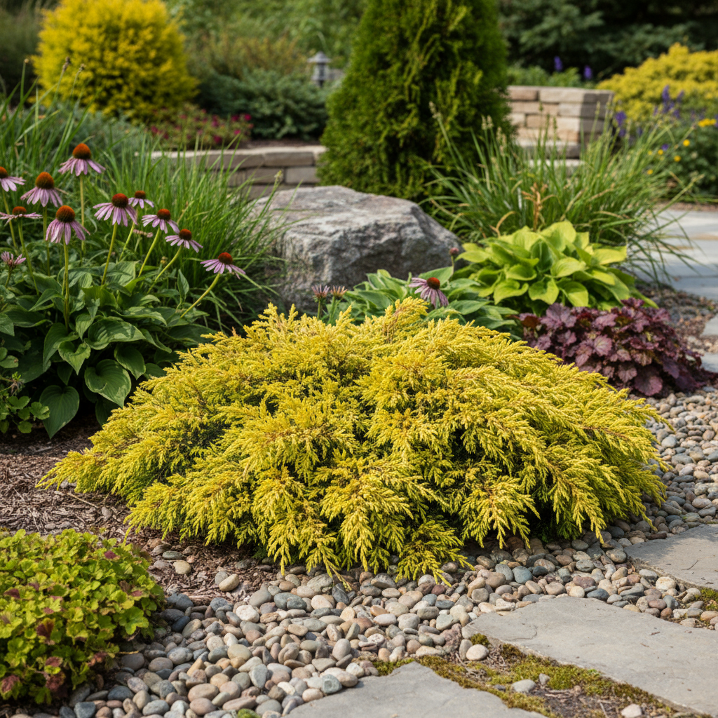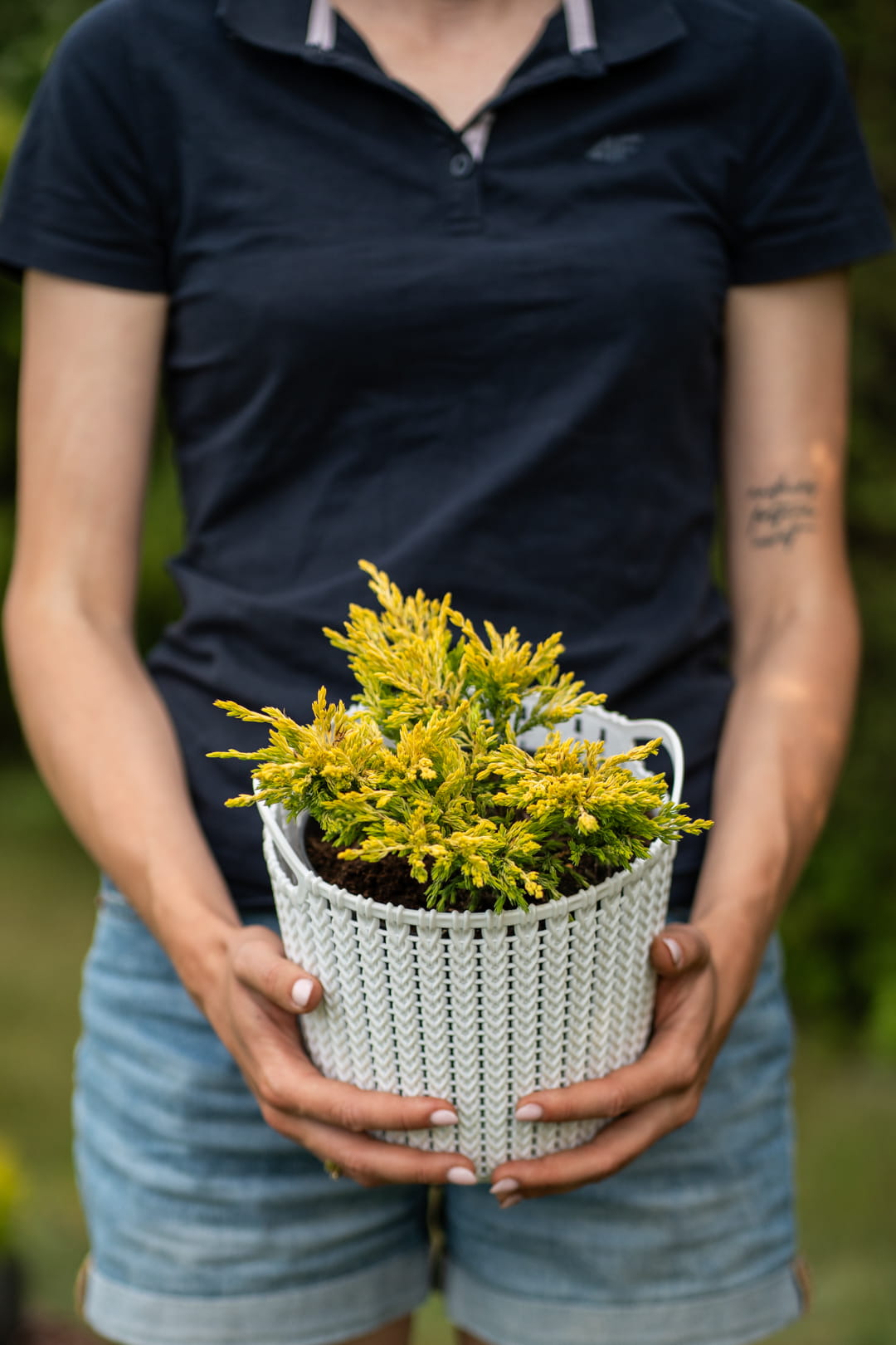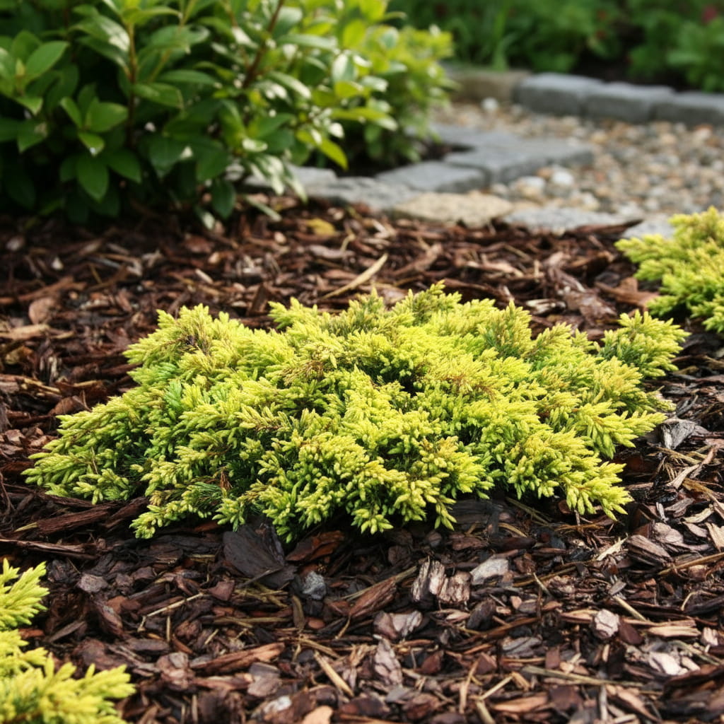 Jałowiec pospolity 'Goldschatz' (Juniperus communis) to niska, płożąca odmiana o zwartym pokroju, dorastająca do około 20 cm wysokości i rozrastająca się nawet na 1,5 metra szerokości. Jego największym atutem są intensywnie złocistożółte igły, które utrzymują swoją barwę przez cały rok, rozjaśniając rabaty i skalniaki. Młode przyrosty wiosną są szczególnie jaskrawe, co dodaje roślinie jeszcze większej dekoracyjności. Doskonale sprawdza się jako roślina okrywowa, w ogrodach skalnych, na wrzosowiskach oraz w kompozycjach z innymi iglakami i bylinami.