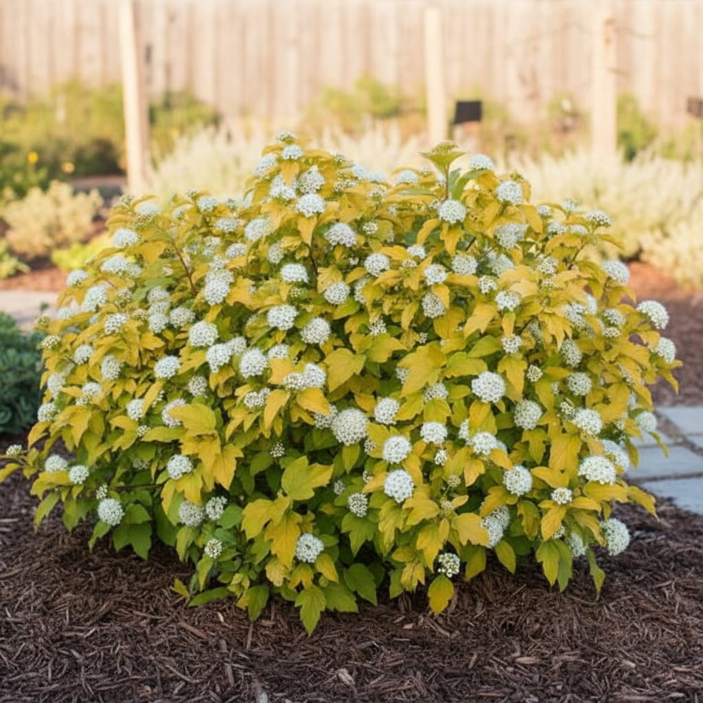 Pęcherznica kalinolistna ‘Dart’s Gold’ (Physocarpus opulifolius) to dekoracyjny, gęsty krzew liściasty o intensywnie złocistym ulistnieniu, które wiosną i latem rozświetla ogród, a jesienią nabiera pomarańczowych i miedzianych odcieni. Roślina dorasta do 1,5–2,5 m wysokości i podobnej szerokości, tworząc zwarty, półkulisty pokrój. W czerwcu i lipcu obsypuje się białymi lub lekko różowymi kwiatami, zebranymi w drobne baldachogrona. Jesienią pojawiają się czerwone, pęcherzykowate owoce, które utrzymują się na krzewie i stanowią dodatkową ozdobę. Idealna do sadzenia na rabatach, pojedynczo, w grupach oraz na formowane i naturalne żywopłoty. Dzięki intensywnemu złocistemu ulistnieniu i niewielkim wymaganiom pęcherznica ‘Dart’s Gold’ to doskonały wybór dla każdego, kto szuka efektownej, łatwej w uprawie rośliny do ogrodu!