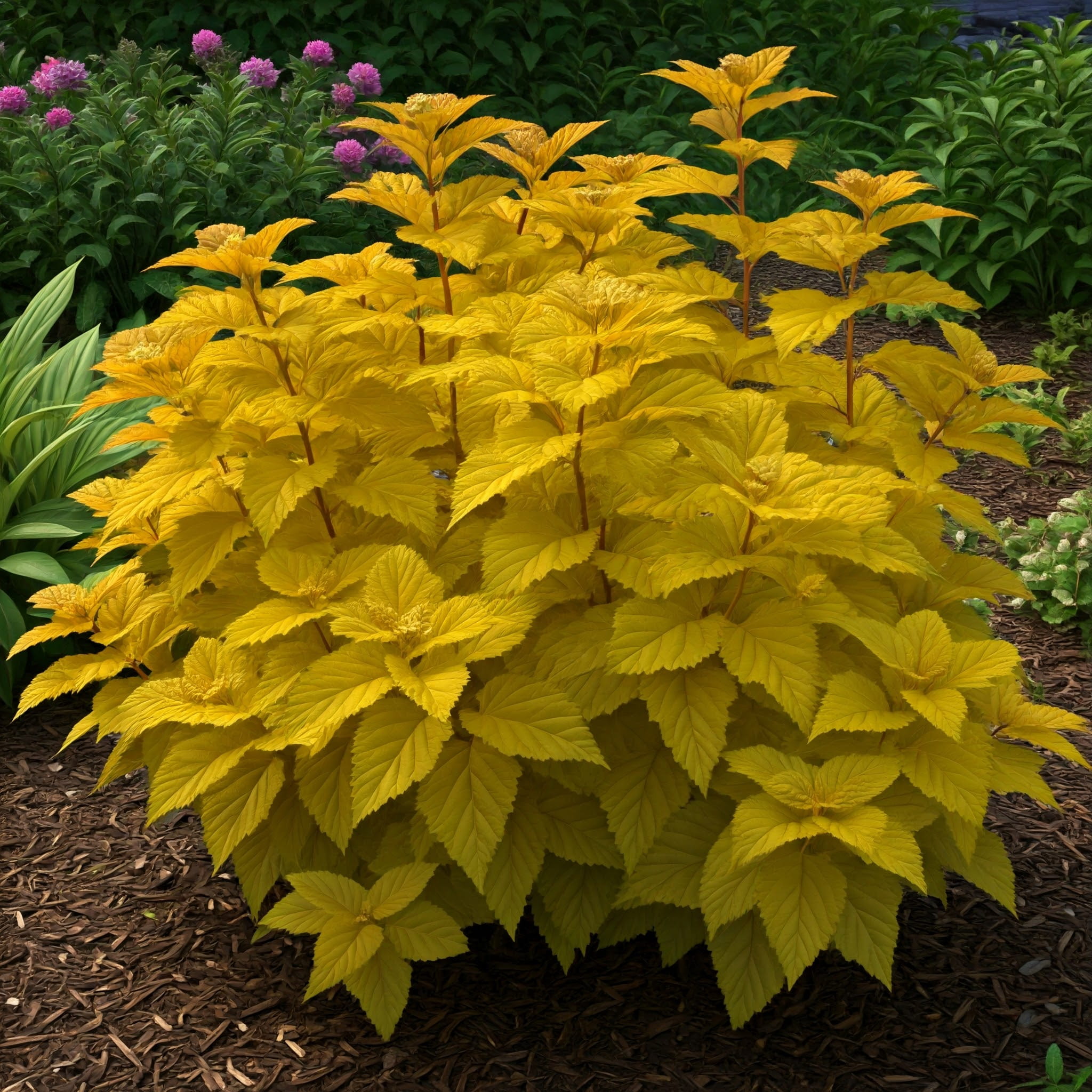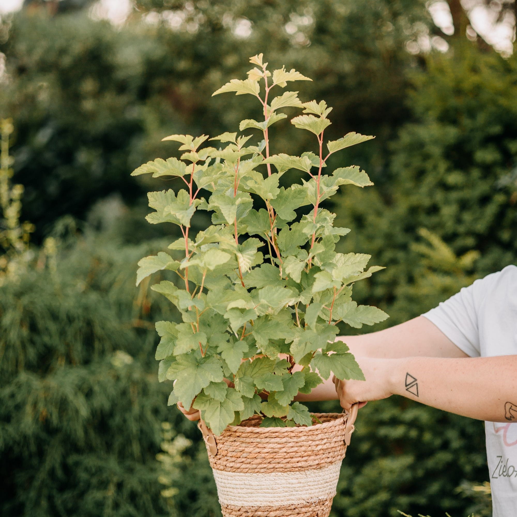 Pęcherznica kalinolistna ‘Magic Ball’ (Physocarpus opulifolius) to dekoracyjny, kompaktowy krzew o zmieniającym się zabarwieniu liści, który przez cały sezon zachwyca barwną grą kolorów. Dorasta do około 1 metra wysokości i podobnej szerokości, tworząc gęsty, zaokrąglony pokrój. Młode liście są żółto-pomarańczowe, latem nabierają odcieni złota i limonki, a jesienią przechodzą w intensywną czerwień. W czerwcu pojawiają się delikatne, różowobiałe kwiaty, które dodatkowo podkreślają ozdobny charakter rośliny. Doskonała na rabaty, do nasadzeń pojedynczych, a także jako niski, barwny żywopłot. Dzięki wyjątkowej zmienności kolorów pęcherznica ‘Magic Ball’ tworzy niesamowity efekt w każdej aranżacji ogrodowej!