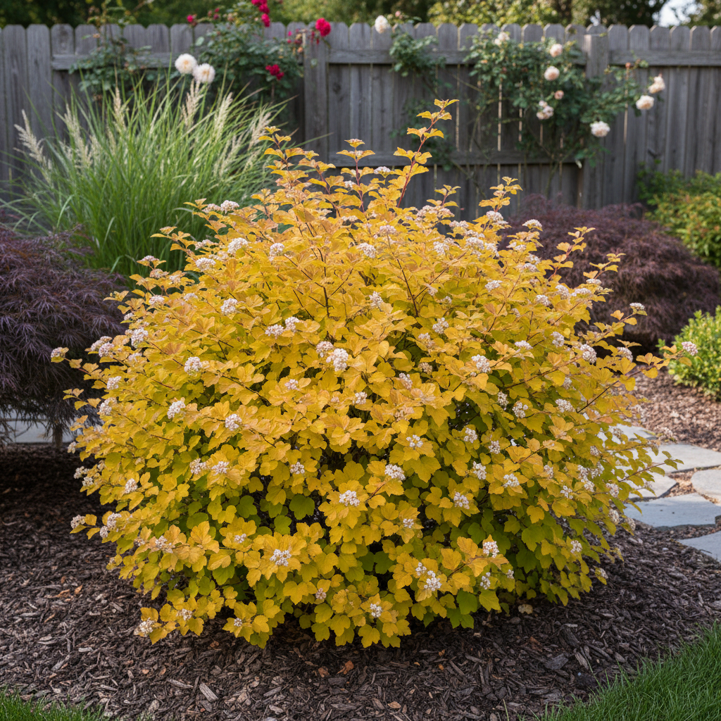 Pęcherznica kalinolistna ‘Nugget’ (Physocarpus opulifolius) to dekoracyjny, gęsty krzew liściasty o intensywnie złocistych liściach, które zachowują swoją barwę przez cały sezon wegetacyjny. Roślina dorasta do 1,5–2 m wysokości i podobnej szerokości, tworząc zwartą, rozłożystą koronę. Wiosną młode liście mają jasnożółty kolor, a latem stają się bardziej złociste z lekkim limonkowym odcieniem. W czerwcu i lipcu pojawiają się białe lub lekko różowawe kwiaty, zebrane w dekoracyjne baldachogrona. Jesienią natomiast krzew zdobią ciemnoczerwone, pęcherzykowate owoce, które długo utrzymują się na gałęziach. Idealna do sadzenia w formie żywopłotów, na rabatach lub pojedynczo. Dzięki pięknemu, złocistemu ulistnieniu i łatwości uprawy pęcherznica ‘Nugget’ to doskonały wybór do każdego ogrodu!