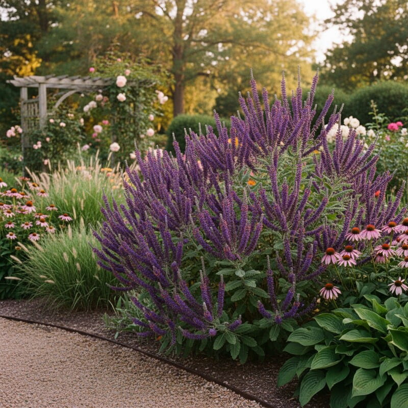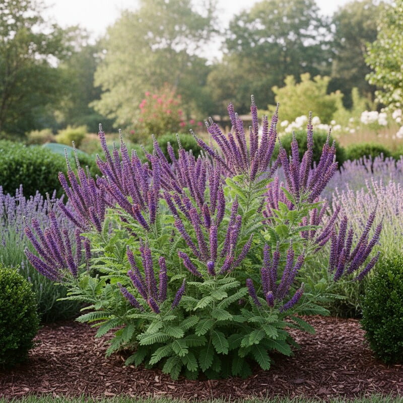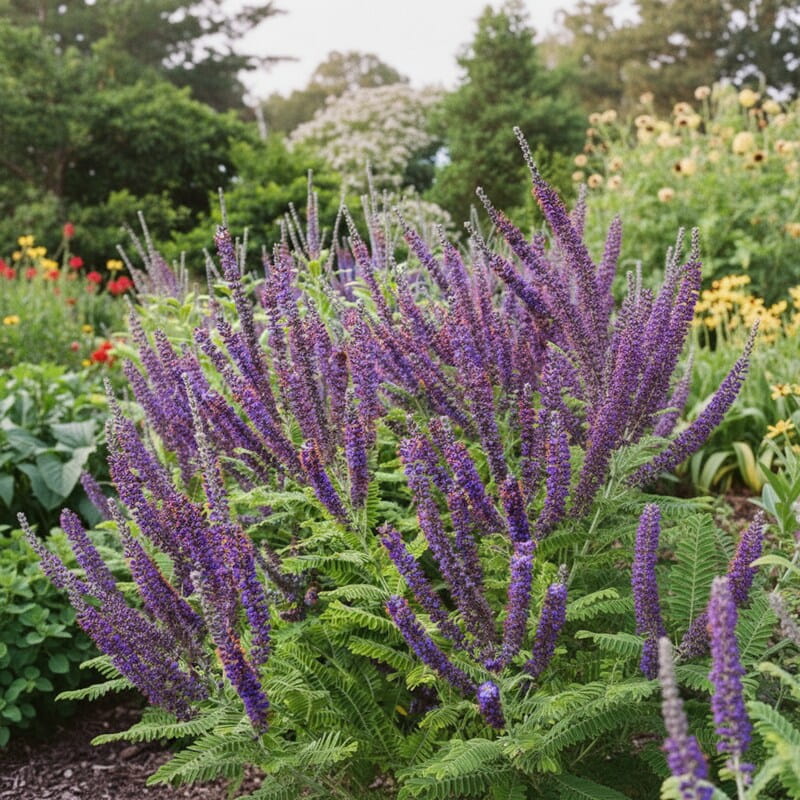 Amorfa szara to krzew o wyjątkowo spokojnym, „pudrowanym” wyglądzie – jej liście są szarozielone i miękko rozjaśniają rabatę, jakby ktoś oprószył je srebrnym pyłkiem. Latem pojawiają się drobne, fioletowe kwiaty zebrane w smukłe kłosy, które dodają całości lekko dzikiego uroku i są chętnie odwiedzane przez owady. Roślina tworzy luźniejszy, naturalny pokrój, dzięki czemu świetnie pasuje do ogrodów w stylu swobodnym i na większe rabaty. To dobry wybór, jeśli chcesz krzewu, który wygląda efektownie, ale nie wymaga ciągłego doglądania. Amorfa jest ceniona za odporność i małe wymagania oraz za to, że wnosi do ogrodu piękny, srebrzysty spokój.