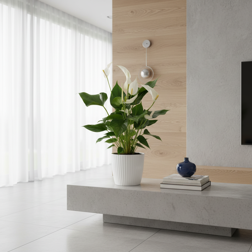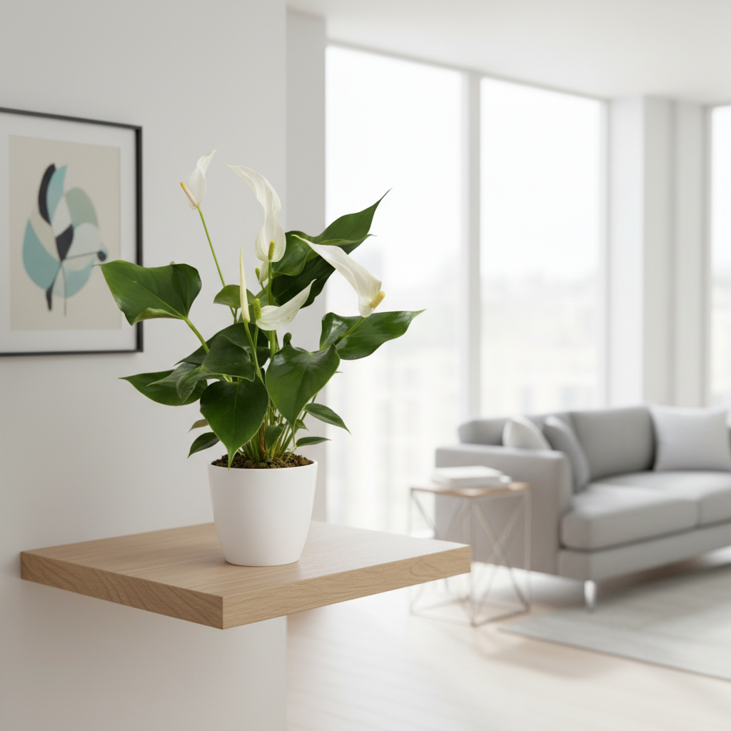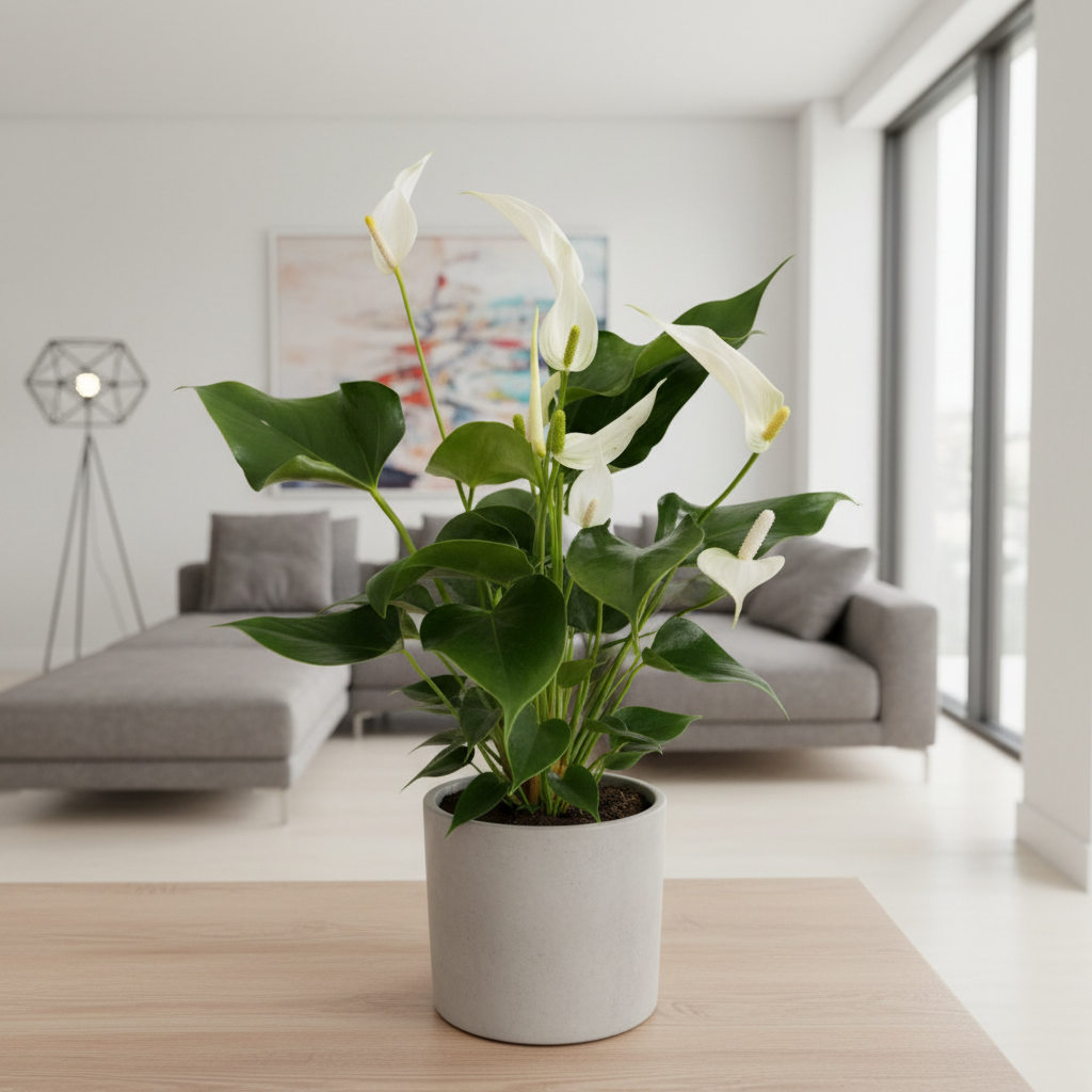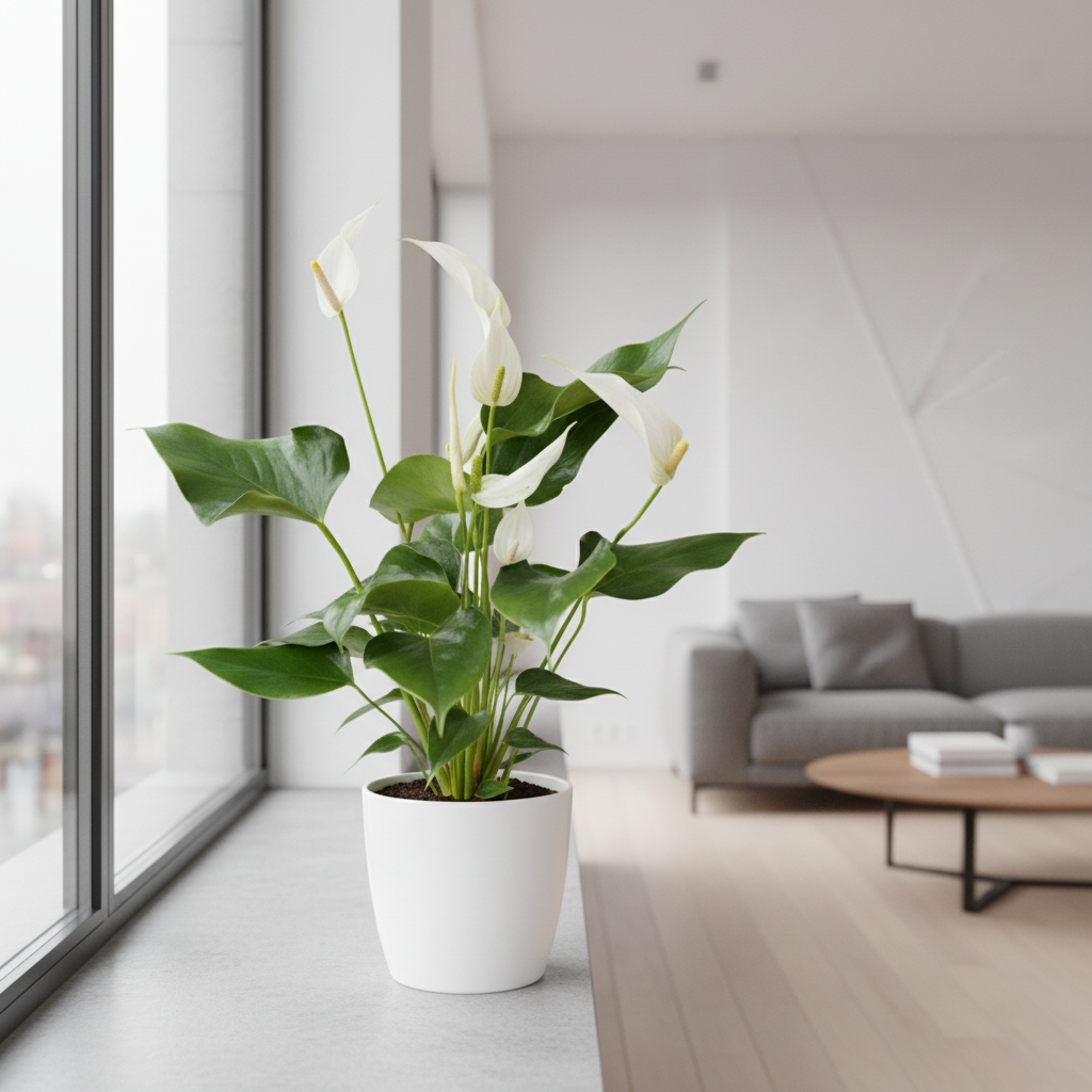 Anturium ‘Banederola Cava’ (Anthurium andraeanum) to elegancka roślina doniczkowa o śnieżnobiałych, błyszczących kwiatach przypominających lakierowane serca z delikatnym połyskiem. Każdy kwiat utrzymuje się długo, dzięki czemu roślina przez wiele tygodni wygląda świeżo i dekoracyjnie. Ciemnozielone, skórzaste liście tworzą piękne tło dla jasnych kwiatów. To idealny wybór do wnętrz – na biurko, parapet czy stolik. Daje efekt czystości, elegancji i spokoju bez dużego wysiłku.