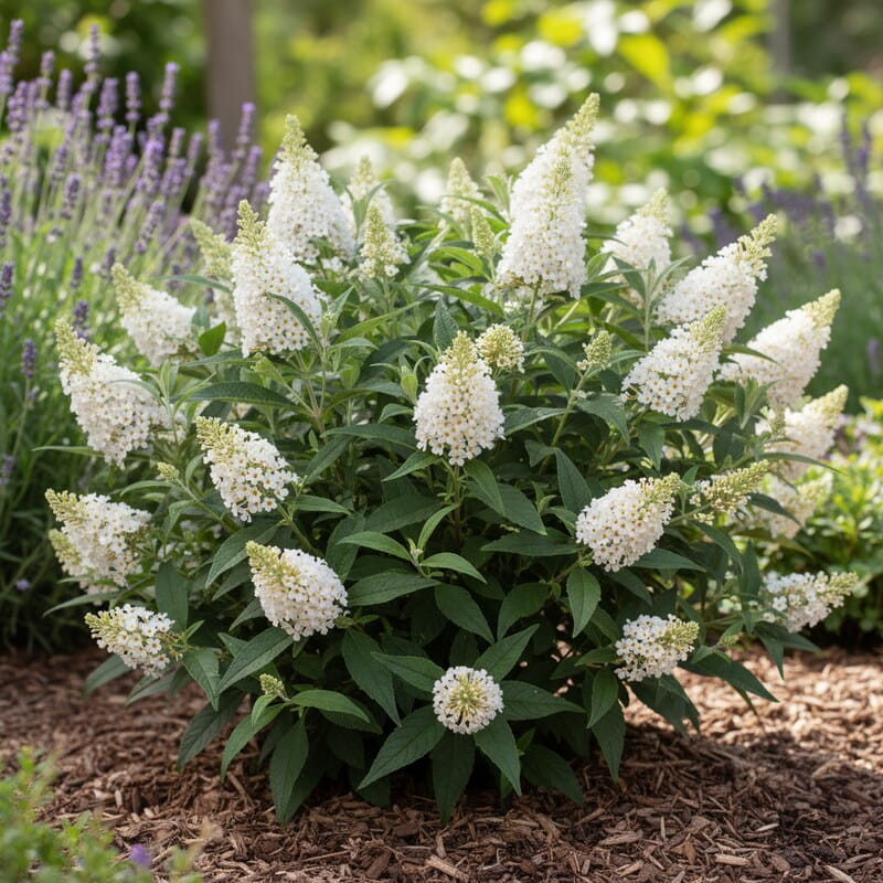 Budleja Dawida ‘Little Rockstars White’ to kompaktowy, niezwykle urokliwy krzew, który latem rozświetla ogród długimi, śnieżnobiałymi kwiatostanami. Każda wiecha jest jak pachnąca świecąca smuga, nad którą niemal stale krążą motyle i trzmiele. Roślina kwitnie długo i bardzo obficie, tworząc efekt lekkiej, jasnej chmurki nad zielonymi liśćmi. Dzięki niewielkim rozmiarom świetnie sprawdzi się nie tylko w ogrodzie, ale też w donicy na tarasie. To idealny wybór, jeśli chcesz wprowadzić do ogrodu dużo światła i stworzyć miejsce pełne owadów.
