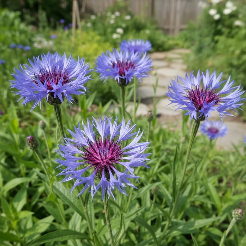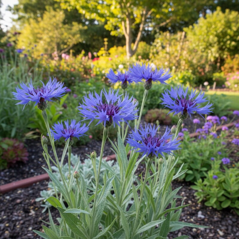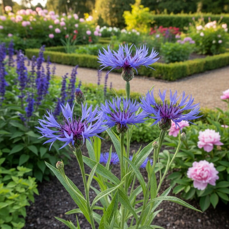 Chaber górski (Centaurea montana) to niezawodna bylina, która wprowadza do ogrodu intensywny, niebieski kolor już późną wiosną. Kwitnie najczęściej od maja do czerwca, a przy sprzyjających warunkach potrafi powtórzyć kwitnienie pod koniec lata. Jego kwiaty są duże, z postrzępionymi płatkami i ciemniejszym środkiem – wyglądają lekko dziko, ale bardzo dekoracyjnie. Roślina dorasta zwykle do około 40–60 cm wysokości i tworzy rozrastające się kępy szarozielonych liści. To świetny wybór, jeśli chcesz mocnego, niebieskiego akcentu na rabacie i rośliny, która jest łatwa w uprawie i odporna na mróz.