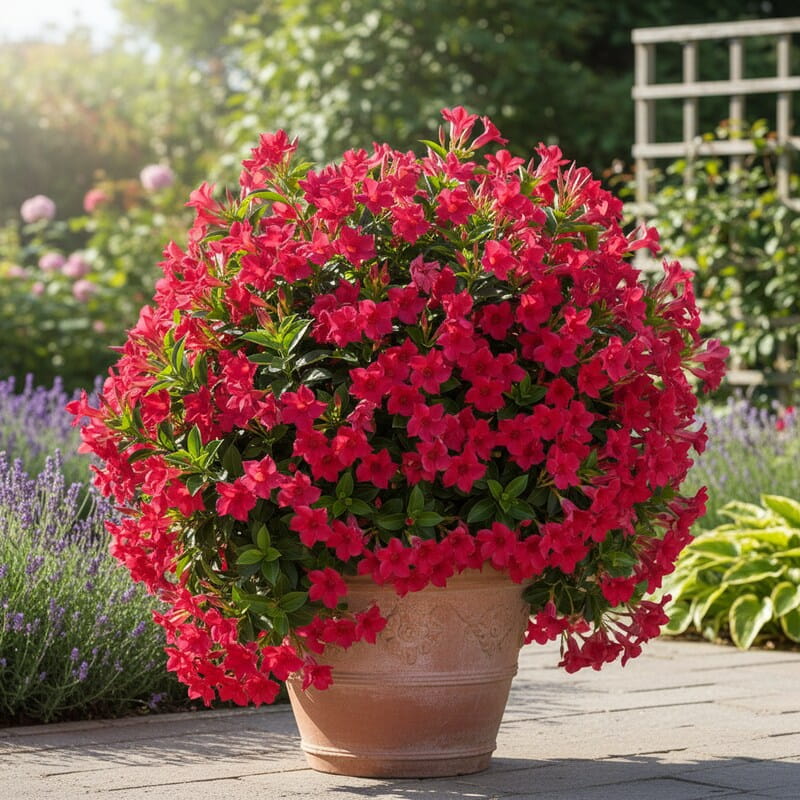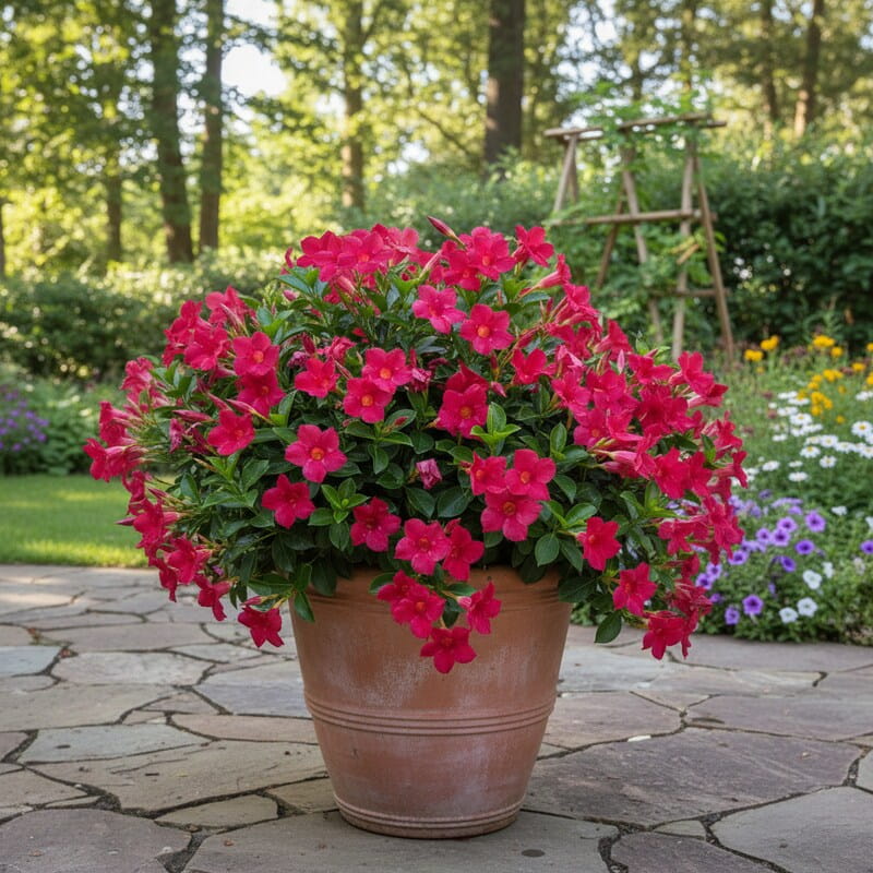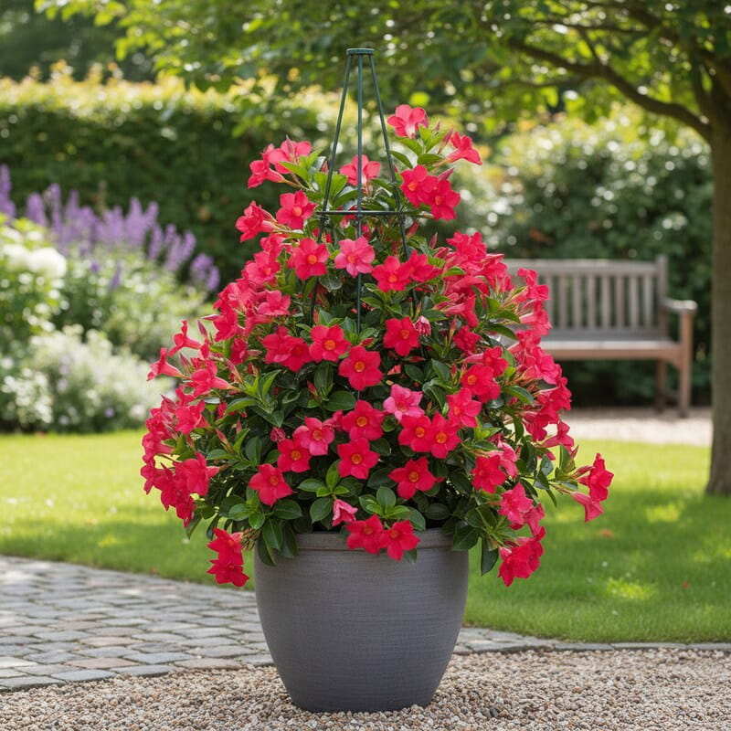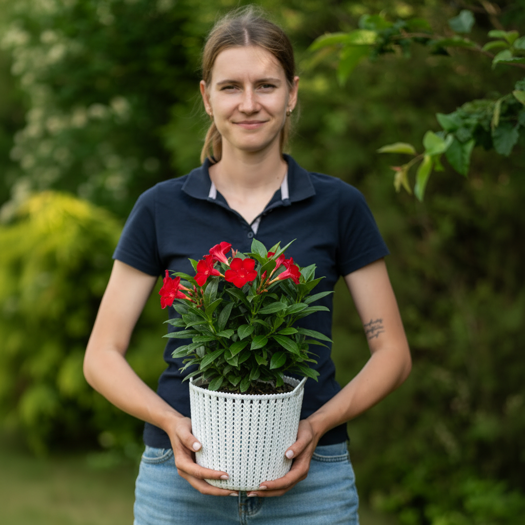 Dipladenia (Mandevilla sanderiana) to efektowna roślina o błyszczących, ciemnozielonych liściach i dużych kwiatach w różnych kolorach – od bieli, przez róż, aż po intensywną czerwień. Jej kwiaty wyglądają jak egzotyczne trąbki rozświetlające balkon lub taras i pojawiają się przez całe lato. Roślina ma lekko pnący lub zwisający pokrój, dzięki czemu pięknie prezentuje się w donicach i skrzynkach. To idealny wybór dla osób, które chcą szybkiego efektu kolorystycznego. Daje egzotyczny klimat i długie, obfite kwitnienie.