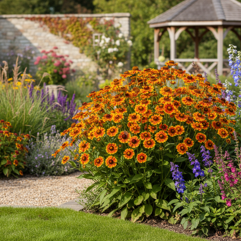 Dzielżan 'Fuego' (Helenium) to energetyczna bylina o niezwykle intensywnych barwach, która rozświetla ogród późnym latem. Dorasta do około 50 cm wysokości i tworzy gęste kępy. Od lipca aż do września obsypuje się kwiatami w odcieniach ognistej czerwieni, pomarańczy i złota, z ciemniejszym środkiem, które przyciągają pszczoły, trzmiele i motyle.