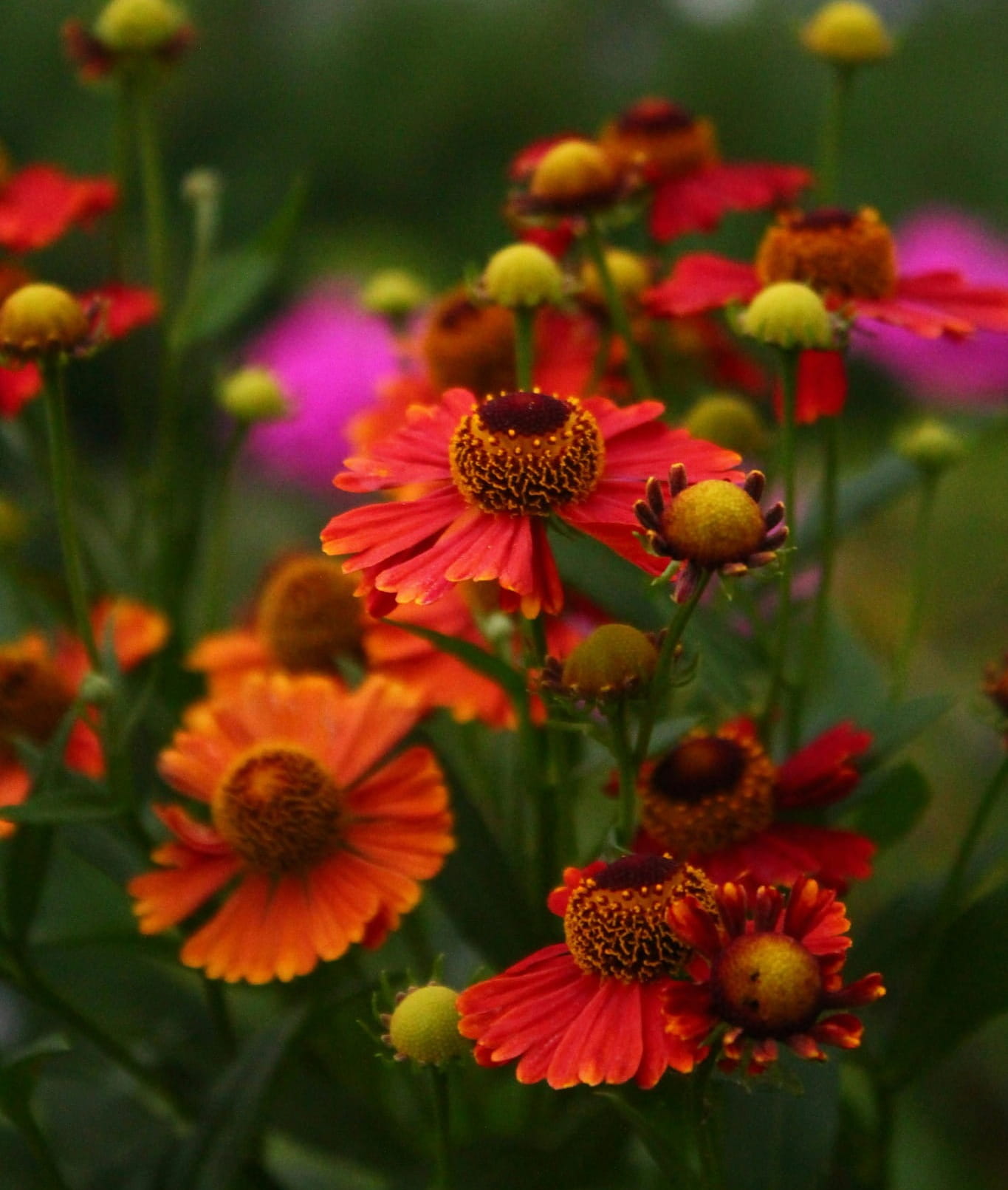 Dzielżan ogrodowy ‘Moerheim Beauty’ (Helenium autumnale) to efektowna, późno kwitnąca bylina o miedzistoczerwonych, lekko błyszczących kwiatach z ciemniejszym środkiem, które pojawiają się od maja aż do lipca. Roślina dorasta do 150 cm wysokości, tworząc wyprostowane, silne pędy, które nie wymagają podpór. Kwiaty przyciągają pszczoły i motyle, a ich ciepła kolorystyka pięknie komponuje się z jesiennymi rabatami. To niezawodna bylina, która wnosi ogniste barwy do ogrodu pod koniec lata.