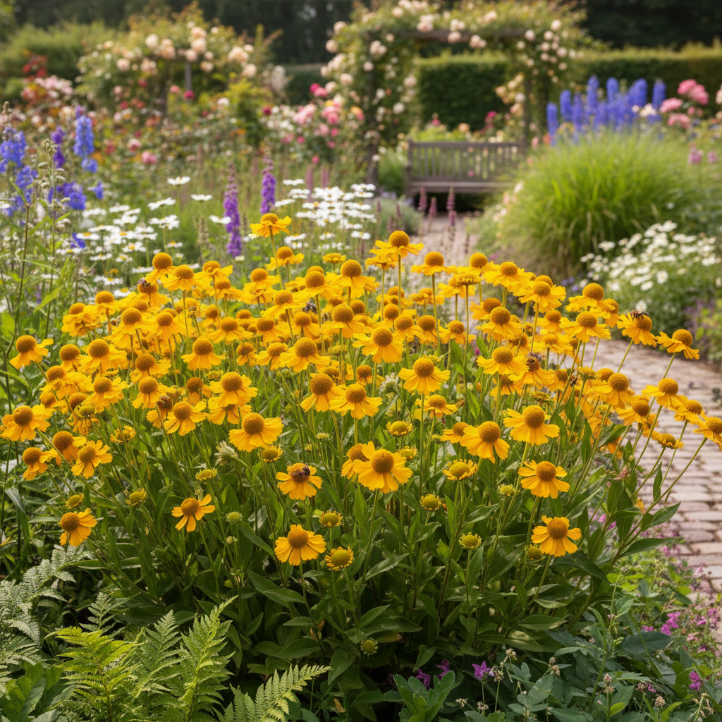 Dzielżan ogrodowy ‘Kanaria’ (Helenium hybridum) to efektowna odmiana dzielżana o dużych, cytrynowożółtych kwiatach z charakterystycznym, wypukłym środkiem w kolorze ciemnej żółci lub brązu. Kwitnie długo i obficie – od lipca do września, dodając rabatom słonecznego, radosnego charakteru. Roślina dorasta do około 120-150 cm wysokości, tworzy wzniesiony, dobrze rozgałęziony pokrój i nie pokłada się. Jej jasne, energetyczne kwiaty rozświetlają ogród i przyciągają owady zapylające, w tym pszczoły i motyle.