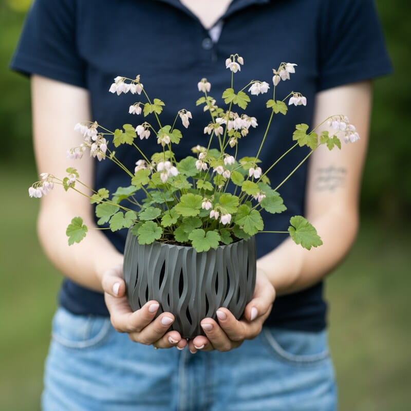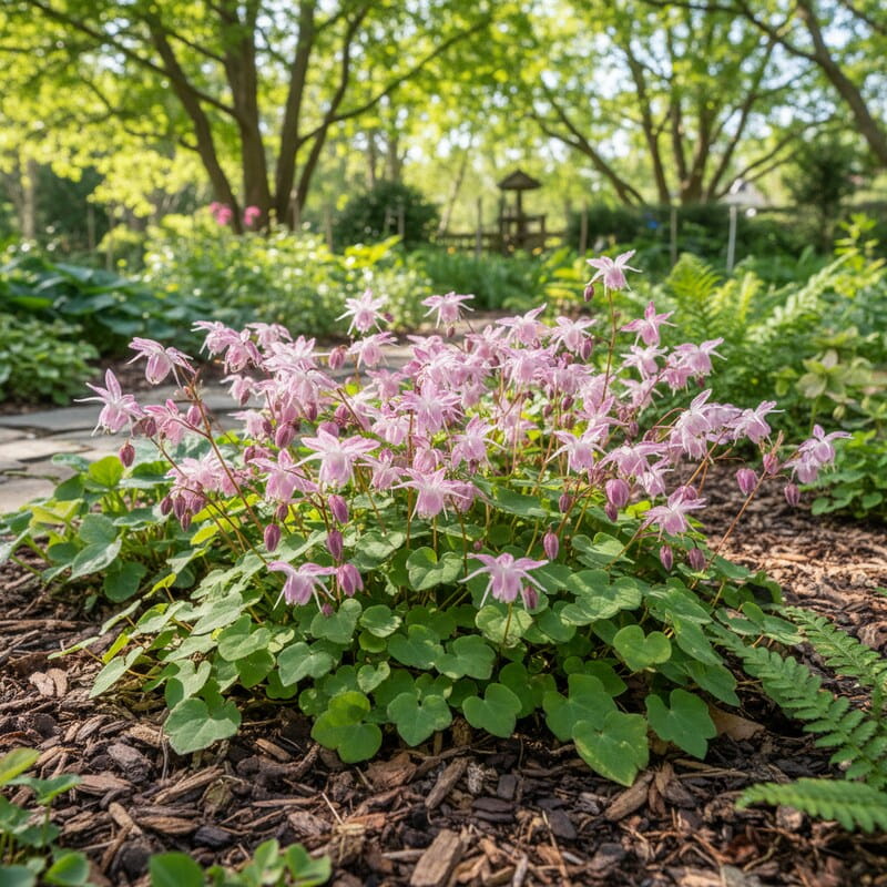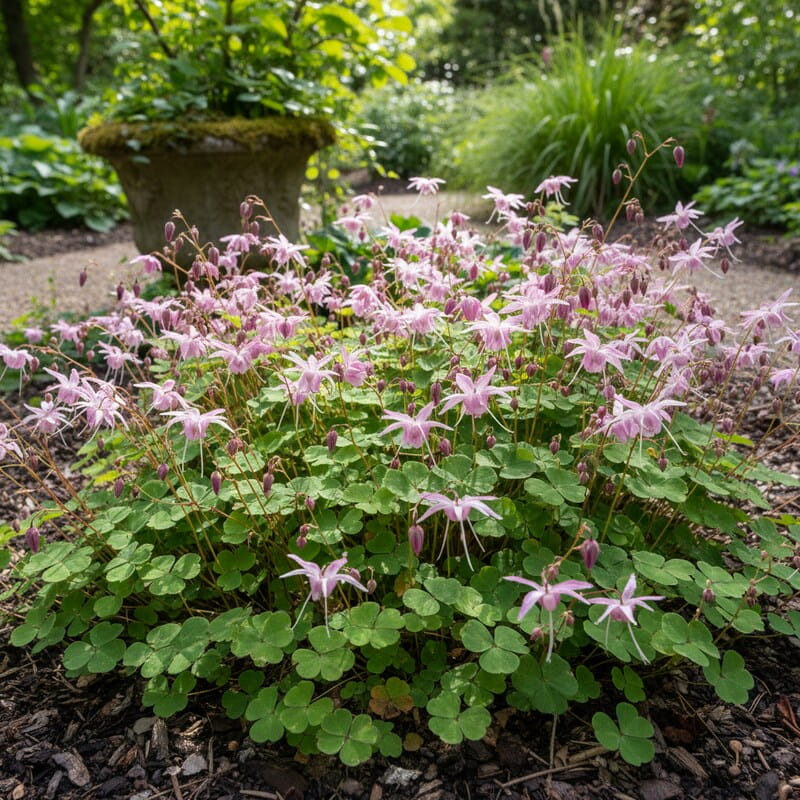 Epimedium Younga ‘Roseum’ (Epimedium × youngianum) to delikatna, ale niezwykle urokliwa bylina do cienia. Kwitnie w kwietniu i maju, wypuszczając nad liśćmi lekkie, różowe kwiaty o finezyjnym kształcie – wyglądają jak małe motyle unoszące się nad rabatą. Dorasta do około 20–30 cm wysokości i stopniowo rozrasta się w zwarte, niskie kępy. Wiosną młode liście mają lekko czerwonawy odcień, później stają się świeżo zielone i zdobią ogród aż do jesieni. To idealna roślina, jeśli chcesz stworzyć romantyczny, leśny klimat w cieniu i jednocześnie mieć trwałą, zadarniającą bylinę pod drzewa, która nie wymaga ciągłej uwagi.