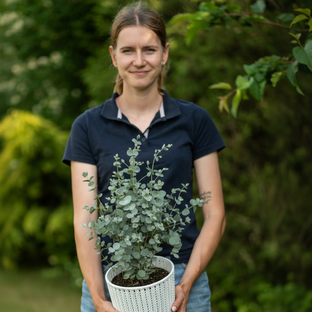 Eukaliptus ‘Gunii’ (Eucalyptus gunnii) to niezwykle dekoracyjna roślina o okrągłych, srebrzystoniebieskich liściach, które wyglądają jak delikatne monety pokryte chłodnym, matowym połyskiem. Liście wydzielają przyjemny, świeży zapach, szczególnie po dotknięciu. Rośnie szybko i tworzy lekką, przewiewną koronę. Świetnie sprawdzi się w donicy na tarasie lub jako ozdoba ogrodu w cieplejszych miesiącach. To roślina, która daje egzotyczny efekt i świeżość w przestrzeni.