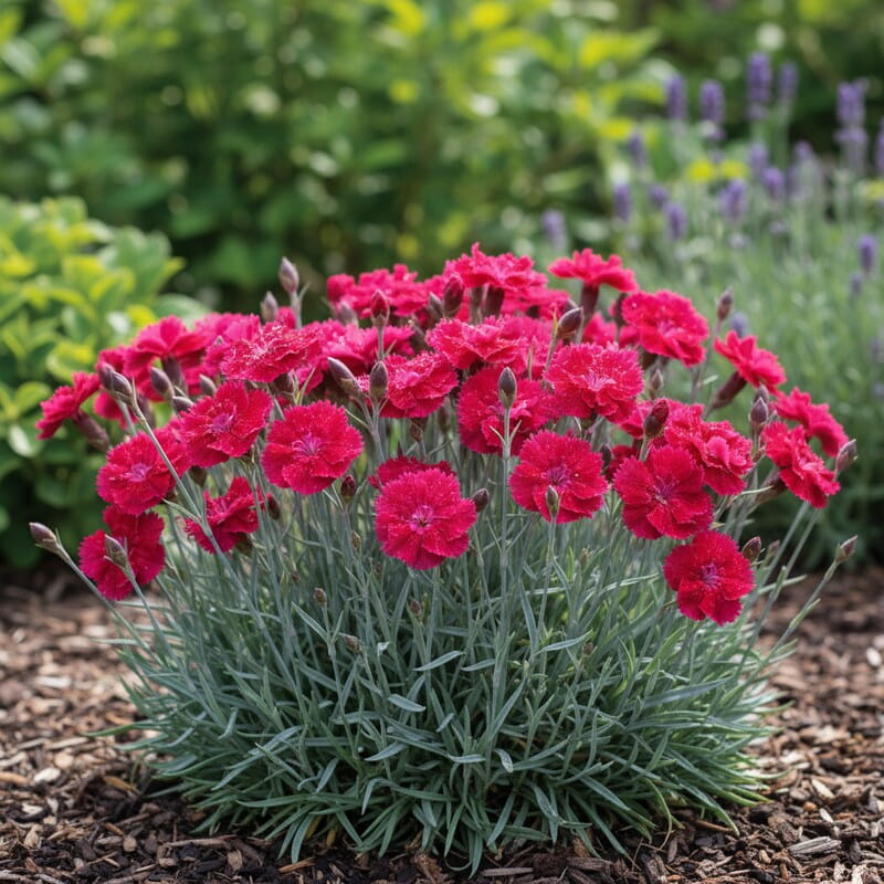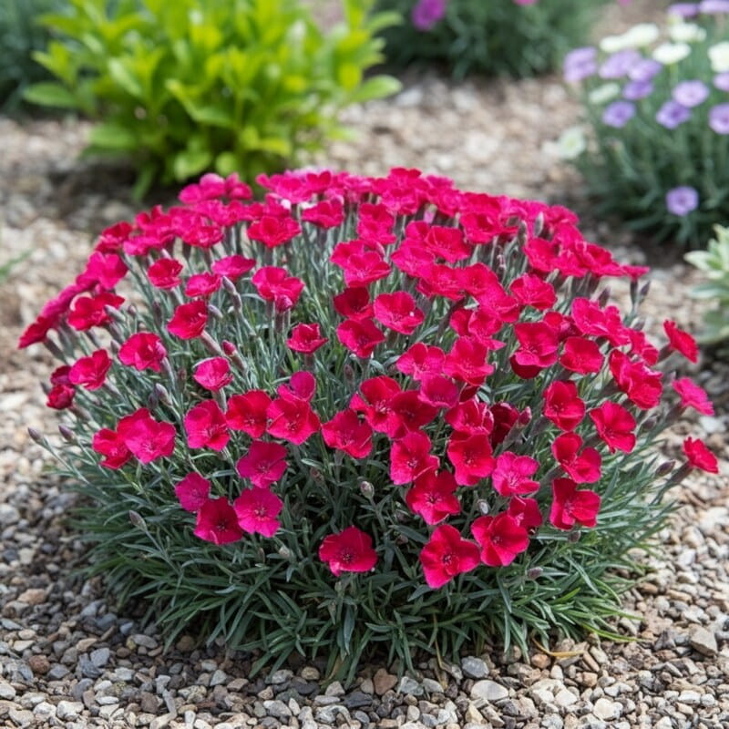 Goździk siny ‘Bombardier’ to niska, zwarta bylina o niezwykle efektownych, intensywnie purpurowo-fioletowych kwiatach, które latem tworzą piękną, kolorową plamę na rabatach. Roślina wyróżnia się zwartym pokrojem i gęstą rozetą zielonych liści, dzięki czemu kwiaty unoszą się nad liśćmi niczym dekoracyjne akcenty. Doskonale sprawdza się na obrzeżach rabat, skalniakach i w pojemnikach, wprowadzając wyrazisty, radosny kolor. Jeśli chcesz mieć roślinę, która tworzy intensywną, purpurową plamę kwiatów i łatwo utrzymać ją w ogrodzie, goździk siny ‘Bombardier’ będzie doskonałym wyborem.