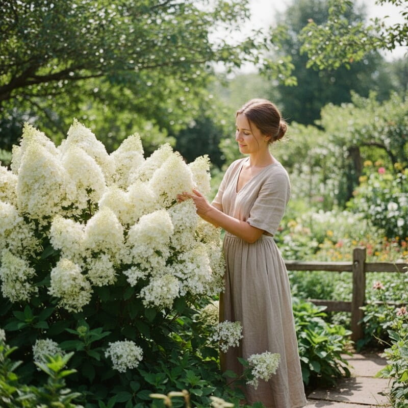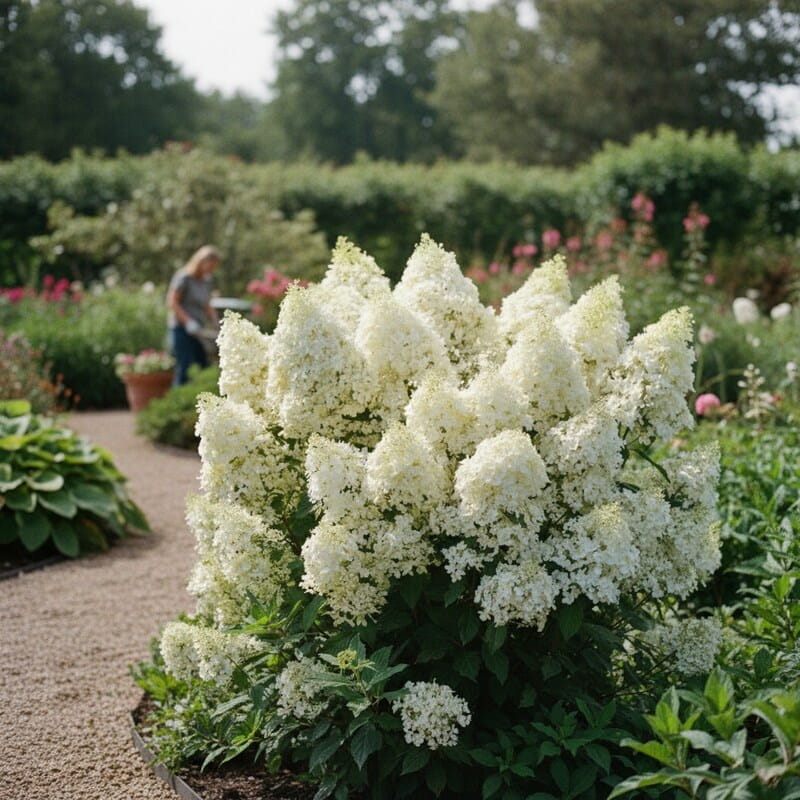 Hortensja bukietowa ‘Magical Matterhorn’ to elegancka odmiana o dużych, stożkowych kwiatostanach w czystej bieli, które z czasem delikatnie się ocieplają. Jej kwiaty wyglądają jak śnieżne szczyty gór unoszące się nad zielenią, nadając ogrodowi świeżości i lekkości. Roślina ma zwarty, uporządkowany pokrój i mocne pędy, które dobrze utrzymują ciężkie kwiaty. Świetnie sprawdzi się na rabatach, wzdłuż ścieżek i w donicach. To wybór dla tych, którzy chcą eleganckiego efektu bez przesady.