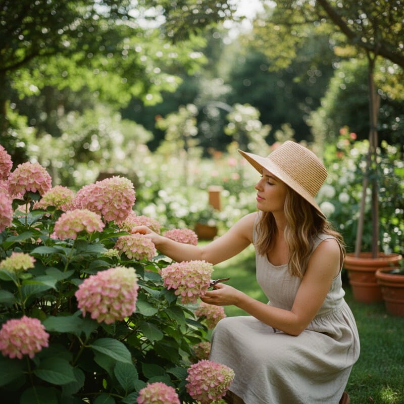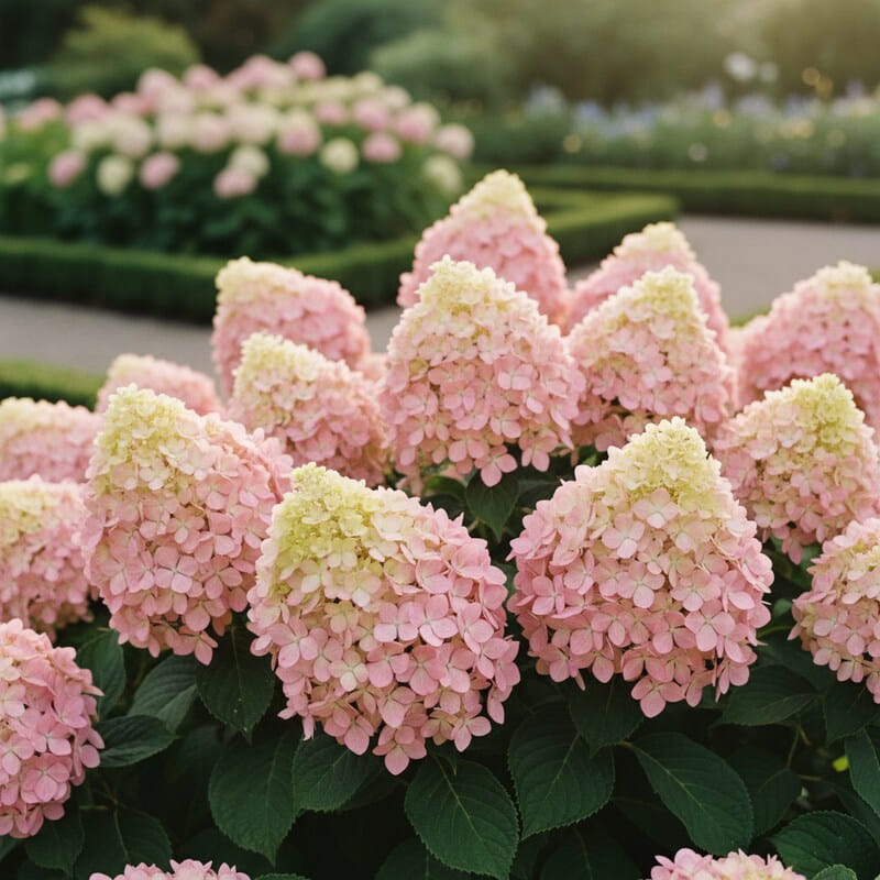 Hortensja bukietowa ‘Pixio’ to kompaktowa odmiana o dużych, stożkowych kwiatostanach, które zmieniają kolor w trakcie sezonu. Na początku są jasne, niemal kremowe, a z czasem nabierają różowych tonów, tworząc efekt delikatnie rumieniących się kwiatów. Jej zwarty pokrój sprawia, że świetnie sprawdza się w mniejszych ogrodach, na rabatach i w donicach. Odmiana wyróżnia się długim kwitnieniem i łatwością uprawy. To roślina, która daje dużo efektu przy niewielkiej przestrzeni.