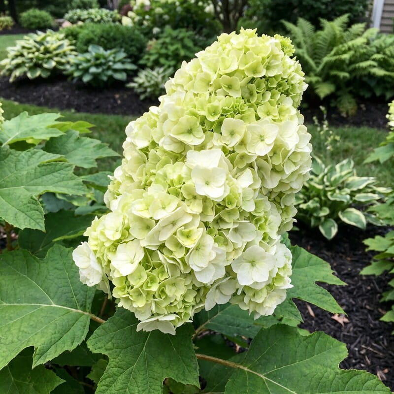 Hortensja dębolistna ‘Tara’ zachwyca liśćmi przypominającymi dębowe – głęboko powcinane, miękkie w dotyku, które jesienią przebarwiają się na odcienie czerwieni i purpury niczym płonący krzew. Latem pojawiają się kremowobiałe kwiaty zebrane w stożkowate wiechy, które z czasem delikatnie różowieją. To odmiana kompaktowa, idealna do mniejszych ogrodów i na rabaty przy tarasie. Łączy dekoracyjne liście i efektowne kwiaty, dzięki czemu zdobi przestrzeń przez wiele miesięcy. Posadź ją solo lub w towarzystwie traw – zawsze przyciąga wzrok.