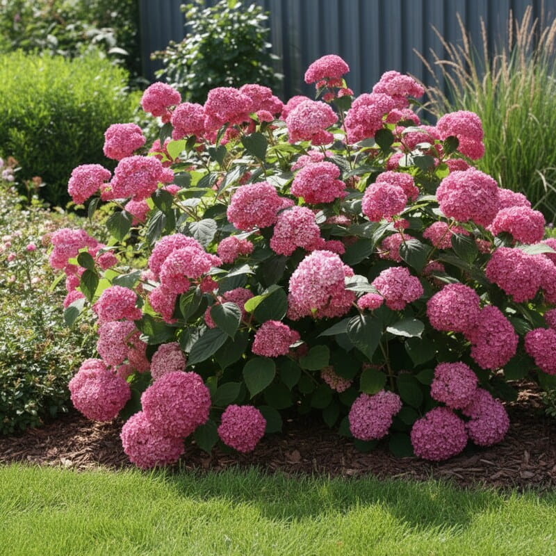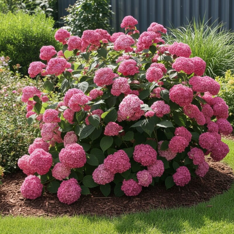 Ta hortensja tworzy miękkie, kuliste kwiatostany w intensywnie różowym kolorze, które wyglądają jak puszyste pompony zawieszone nad krzewem. Kwitnie bardzo obficie, a nowe pędy nieustannie dokładają kolejne kwiaty, dzięki czemu efekt jest długotrwały i pełny życia. To jedna z najbardziej niezawodnych hortensji o różowych kwiatach, która dobrze radzi sobie nawet w mniej sprzyjających warunkach. Jej pokrój jest zwarty, ale lekko rozłożysty, więc świetnie wypełnia przestrzeń w ogrodzie. Idealna do sadzenia pojedynczo lub w małych grupach, gdzie może grać pierwsze skrzypce.