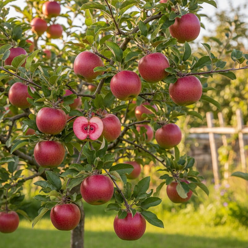 Jabłoń czerwonomiąższowa to prawdziwa ciekawostka w ogrodzie – jej owoce kryją w środku intensywnie czerwony miąższ, który wygląda jak arbuz zamknięty w jabłku. Z zewnątrz często mają ciemniejszą, rumianą skórkę, a po przekrojeniu zaskakują kolorem i lekko kwaskowym, orzeźwiającym smakiem. Wiosną drzewko zdobią różowawe kwiaty, które dodają mu uroku i przyciągają wzrok. To roślina, która łączy efekt dekoracyjny z nietypowymi owocami. Jeśli chcesz wyróżnić swój ogród, to odmiana, która robi wrażenie na każdym.