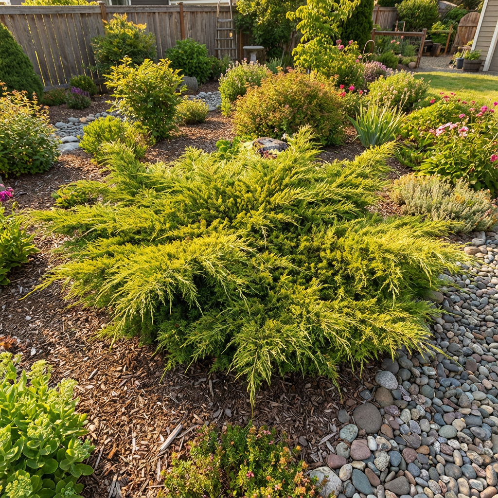 Jałowiec pośredni 'Old Gold' (Juniperus × pfitzeriana) to niska, rozłożysta odmiana jałowca o wyjątkowo dekoracyjnym, złocistym ulistnieniu. Dorasta do około 40 cm wysokości i rozrasta się nawet do 1,5 m szerokości, tworząc gęsty, nieregularny pokrój. Igły są miękkie, wachlarzowato ułożone i przez cały rok utrzymują intensywnie złocistożółty kolor, szczególnie wyraźny na młodych przyrostach. Złote wybarwienie czyni z 'Old Gold' efektowną ozdobę ogrodu przez cały rok – zarówno latem, jak i zimą. Świetnie sprawdza się jako roślina pojedyncza, w grupach, a także w kompozycjach z innymi iglakami i bylinami.