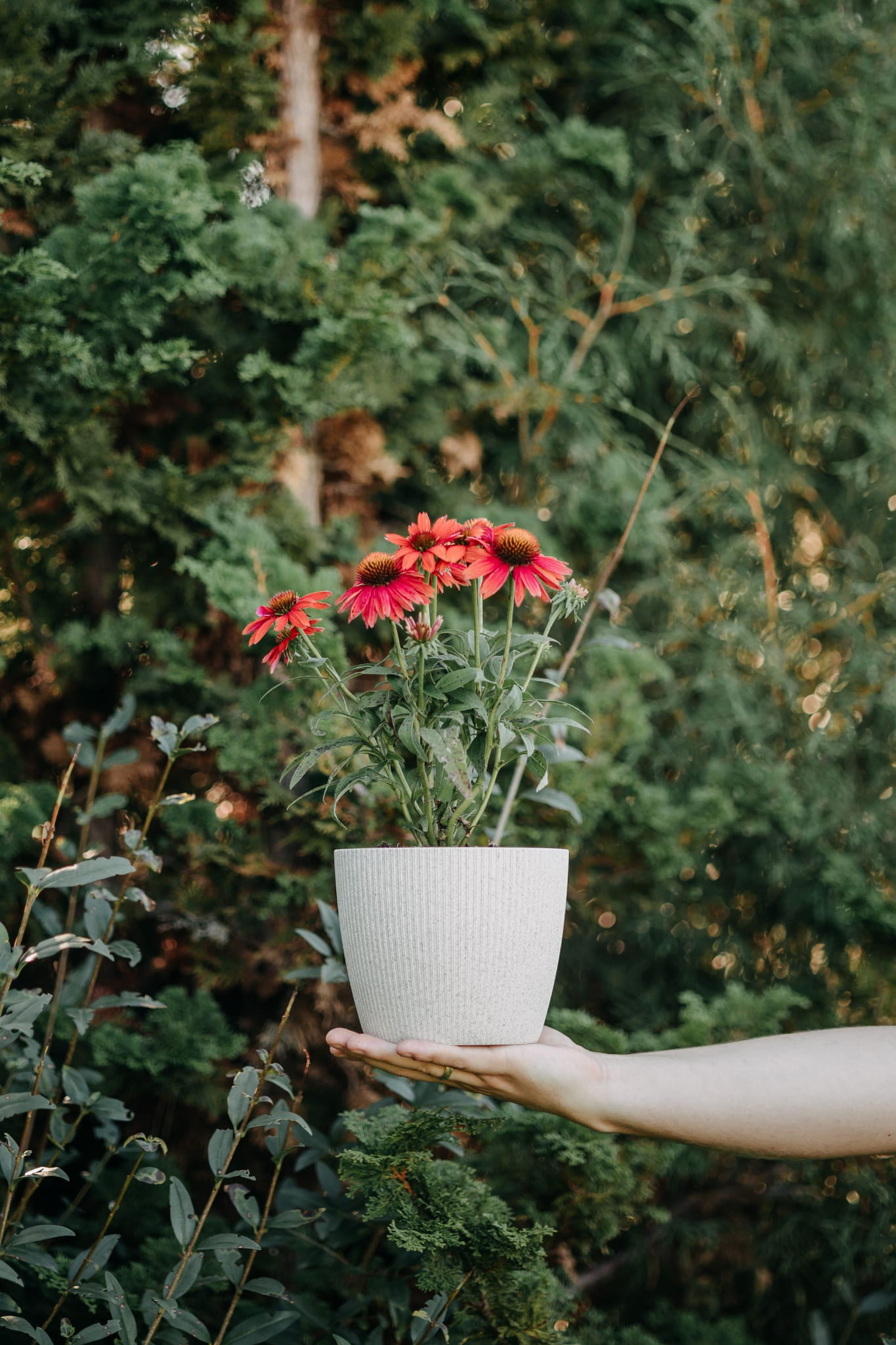 Jeżówka purpurowa ‘Sombrero® Salsa Red’ to efektowna bylina o dużych, intensywnie czerwonych kwiatach, które latem unoszą się na mocnych, wyprostowanych łodygach nad gęstą rozetą ciemnozielonych liści. Jej wyrazisty kolor wprowadza energię i dynamiczny akcent do rabat, skalniaków i pojemników. Roślina długo kwitnie, przyciąga motyle i pszczoły, a dzięki odporności i łatwej pielęgnacji zachwyca przez całe lato. Jeśli szukasz rośliny, która ożywia ogród intensywną czerwienią kwiatów i łatwo utrzymać ją w ogrodzie, jeżówka ‘Sombrero® Salsa Red’ będzie doskonałym wyborem.