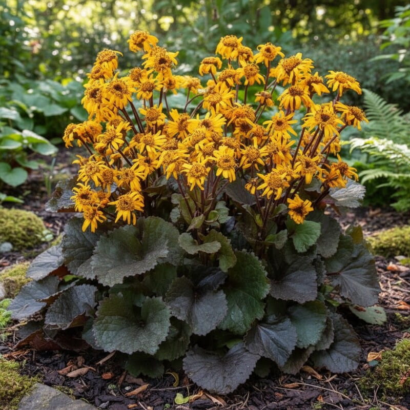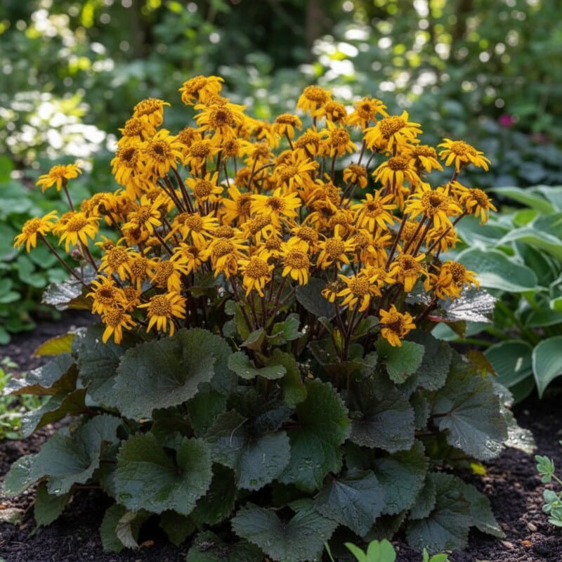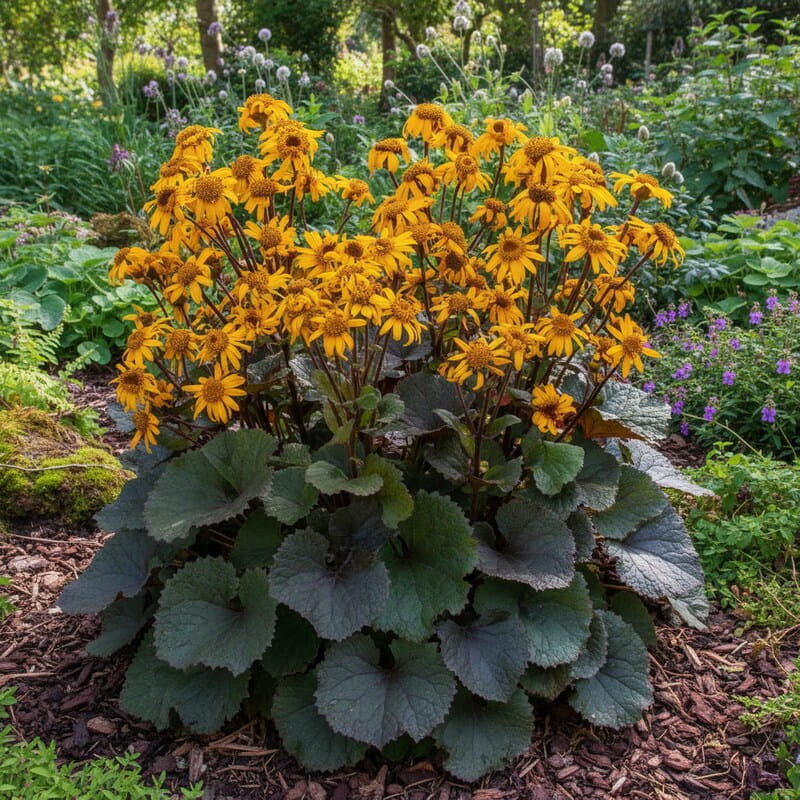 Języczka pomarańczowa (Ligularia dentata) to efektowna bylina, która przyciąga wzrok zarówno liśćmi, jak i kwiatami. Od lipca do września nad dużą, gęstą kępą liści pojawiają się intensywnie pomarańczowe, czasem lekko miedziane koszyczki kwiatów, osadzone na sztywnych łodygach. Roślina dorasta zwykle do około 80–120 cm wysokości w czasie kwitnienia, a jej szerokie, sercowate liście potrafią osiągać imponujące rozmiary. Dzięki temu tworzy mocny, wyrazisty akcent w ogrodzie. To idealny wybór, jeśli chcesz uzyskać egzotyczny efekt dużych liści i jednocześnie cieszyć się długim, ciepłym kolorem pod koniec lata, kiedy wiele roślin zaczyna już przekwitać.