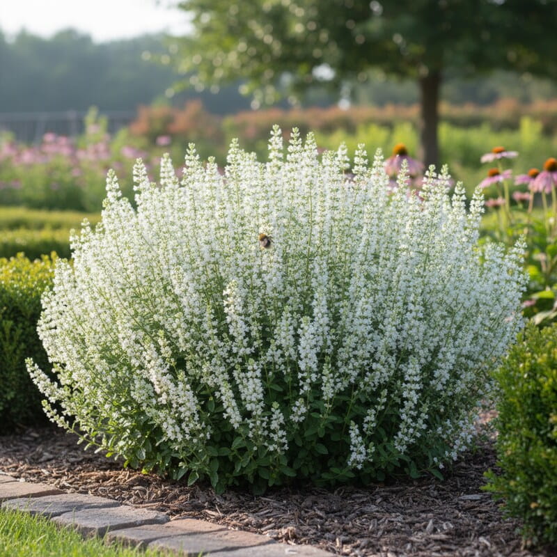 Kalaminta mniejsza ‘Marvelette White’ (Calamintha nepeta) to drobna, pachnąca bylina, która potrafi kwitnąć niemal bez przerwy. Zwykle startuje w czerwcu i trzyma kwiaty aż do września, a czasem nawet do października, tworząc chmurkę maleńkich, białych kwiatów nad kępą aromatycznych liści. Roślina jest kompaktowa – dorasta najczęściej do około 20–30 cm wysokości i podobnie się rozrasta, dzięki czemu nie rozpycha rabaty. Jej delikatny wygląd jest mylący, bo to prawdziwy twardziel: świetnie znosi słońce i nie kaprysi. To idealny wybór, jeśli chcesz lekkiej, białej mgiełki kwiatów przez całe lato oraz rośliny, która wabi pszczoły i pięknie pachnie po dotknięciu.