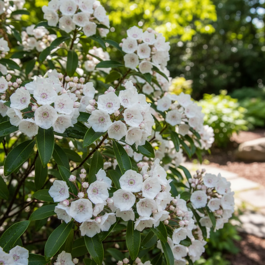 Kalmia szerokolistna ‘Elf’ (Kalmia latifolia ‘Elf’) to urocza, karłowa odmiana kalmii, która zachwyca delikatnymi, białymi kwiatami z subtelnym, różowawym odcieniem i drobnym wzorkiem wewnątrz kielicha. Kwiaty mają charakterystyczny, miseczkowaty kształt i pojawiają się bardzo licznie na przełomie maja i czerwca, tworząc efektowne baldachogrona. Krzew dorasta do około 80–100 cm wysokości, ma zwarty, gęsty pokrój i zimozielone, ciemnozielone liście o skórzastej fakturze. To kompaktowa roślina, która wnosi do ogrodu subtelność i elegancję.