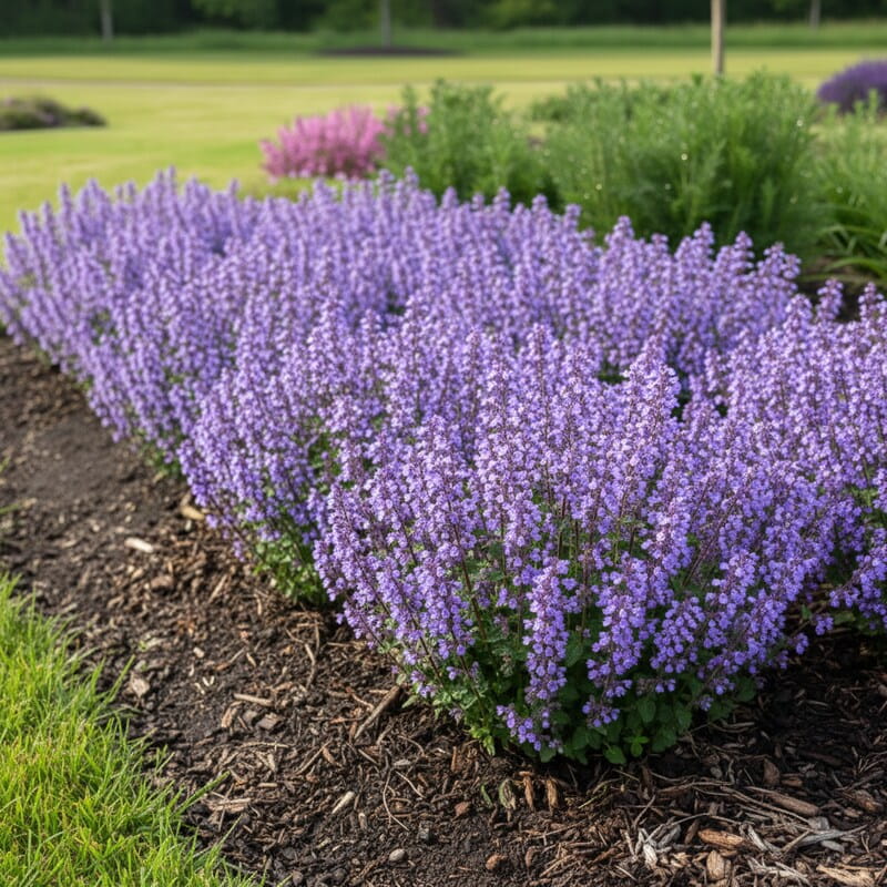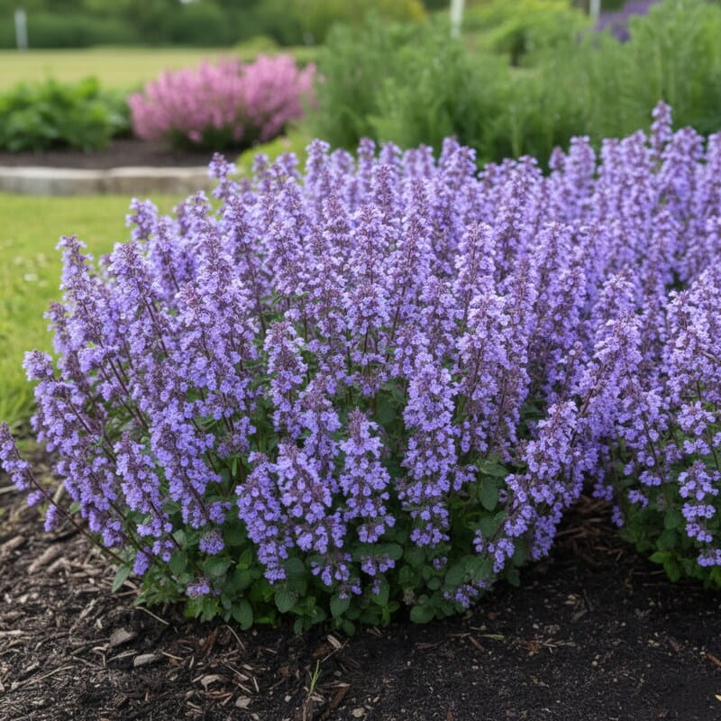 ‘Cat’s Pajamas’ zachwyca purpurowo-niebieskimi kwiatami, które pojawiają się wcześniej niż u większości kocimiętek i tworzą długą, barwną falę aż do jesieni. Jej kępy są zwarte, wyjątkowo równe i pełne, dzięki czemu roślina wygląda jak mała, miękka poducha obsypana kwiatami. To odmiana, która świetnie sprawdza się w małych ogrodach i donicach, bo zawsze trzyma formę. Przyciąga pszczoły, pachnie delikatnie i daje mnóstwo koloru przy minimalnej pracy.