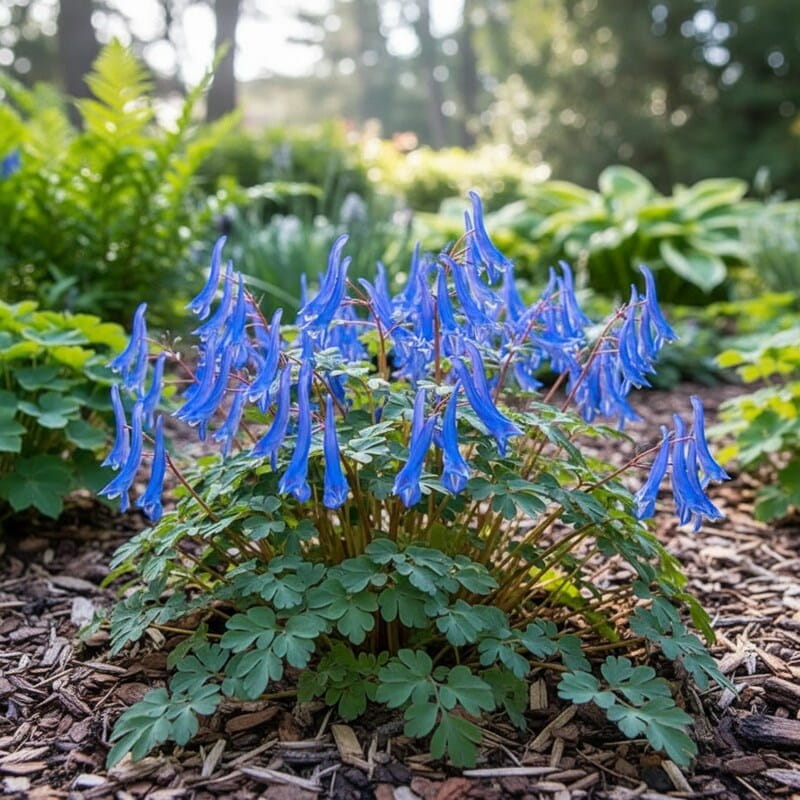 Kokorycz ‘Blue Heron’ to delikatna bylina o lekko zwisających, dzwonkowatych kwiatach w subtelnym, niebiesko-fioletowym odcieniu. Jej ciemnozielone liście tworzą elegancką rozetę, a kwiaty pojawiają się wczesną wiosną, wprowadzając do ogrodu wiosenny akcent. Roślina rośnie powoli, ale stabilnie, tworząc zwarte kępki, które pięknie wypełniają cieniste miejsca. Idealnie nadaje się na rabaty, pod drzewa czy krzewy, gdzie kwitnące pędy delikatnie przenikają przez liście innych roślin. Jeśli chcesz mieć roślinę, która ożywi cień wiosennym kolorem i tworzy subtelne, eleganckie kompozycje, ‘Blue Heron’ będzie doskonałym wyborem.