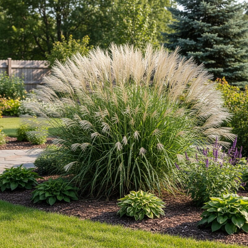 Miskant chiński ‘Silberfeder’ to jedna z najbardziej efektownych traw ozdobnych, która zachwyca dużymi, srebrzystymi kwiatostanami. W czasie kwitnienia wygląda jak rozświetlona, puszysta chmura unosząca się nad zieloną kępą. Liście są długie, lekko przewieszające się, a cała roślina tworzy elegancką, szeroką formę. Odmiana wyróżnia się obfitym kwitnieniem i jasnymi wiechami, które długo utrzymują się na roślinie. To idealny wybór, jeśli chcesz uzyskać mocny, ale lekki efekt dekoracyjny w ogrodzie.