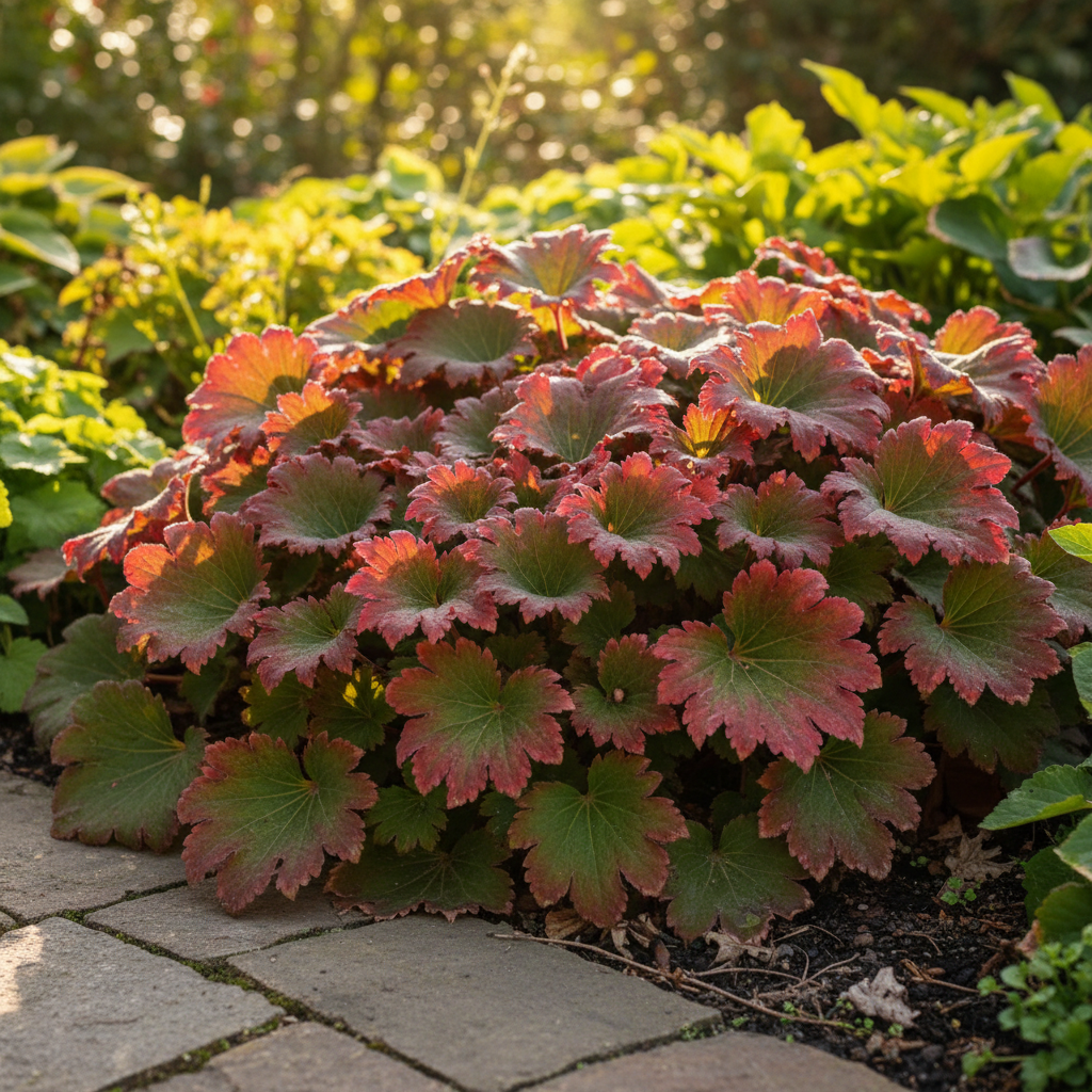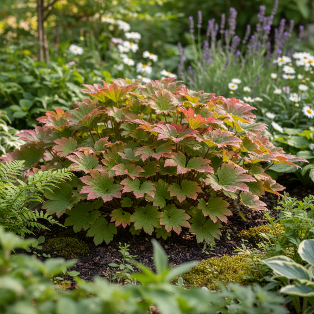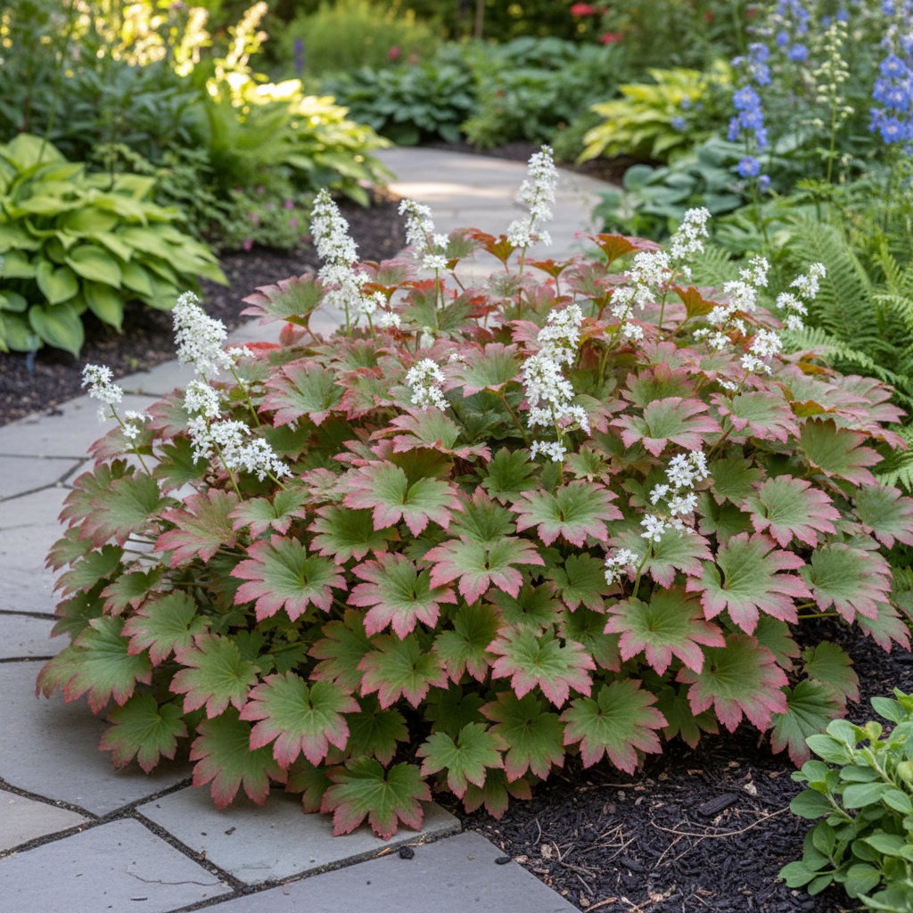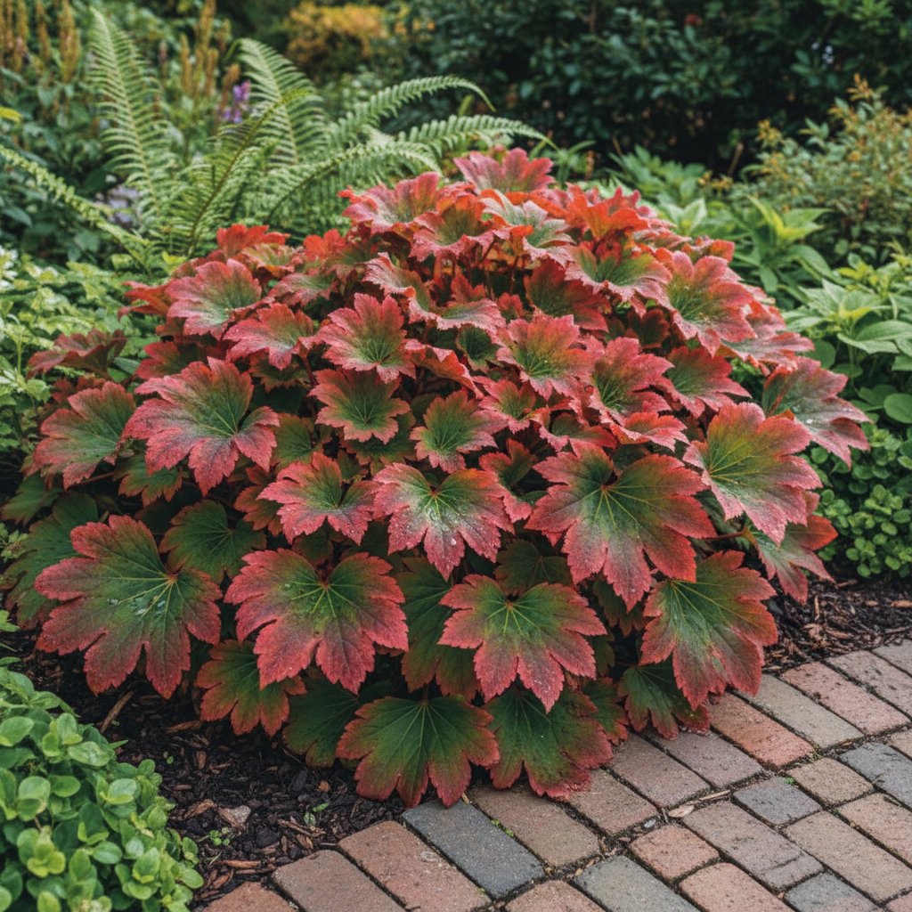 Mukdenia ‘Karasuba’ (Mukdenia rossii) to efektowna bylina ozdobna zarówno z liści, jak i z kwiatów. Tworzy kępy klapowanych, przypominających klon liści, które wiosną są zielone, a latem i jesienią nabierają intensywnych czerwono‑purpurowych przebarwień. Wczesną wiosną, zanim w pełni rozwiną się liście, nad kępą pojawiają się delikatne, białe kwiaty zebrane w luźne wiechy. Roślina dorasta do 30–40 cm wysokości, a dzięki sezonowej zmienności liści jest ozdobą przez cały rok. Jesienne, ogniste wybarwienie liści to największa ozdoba tej odmiany.
