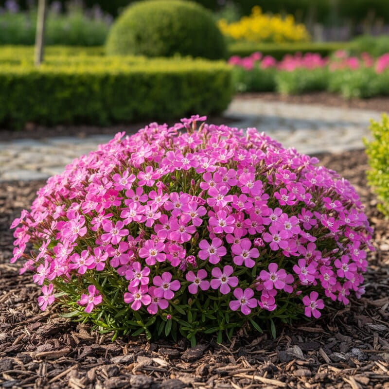 ‘Bressingham’ to pełna uroku bylinowa mydlnica, która wczesnym latem obsypuje się chmurą jasnoróżowych kwiatów wyglądających jak delikatne motylki. Kępa rośnie nisko i szeroko, szybko wypełniając wolne przestrzenie świeżą zielenią. Jej kwiaty pojawiają się licznie i długo utrzymują lekki, naturalny efekt na rabacie. Roślina świetnie sprawdza się na skarpach, przy ścieżkach i w ogrodach naturalnych. Pokochasz ją za bezproblemowy wzrost i miękki, romantyczny wygląd niemal bez wysiłku.