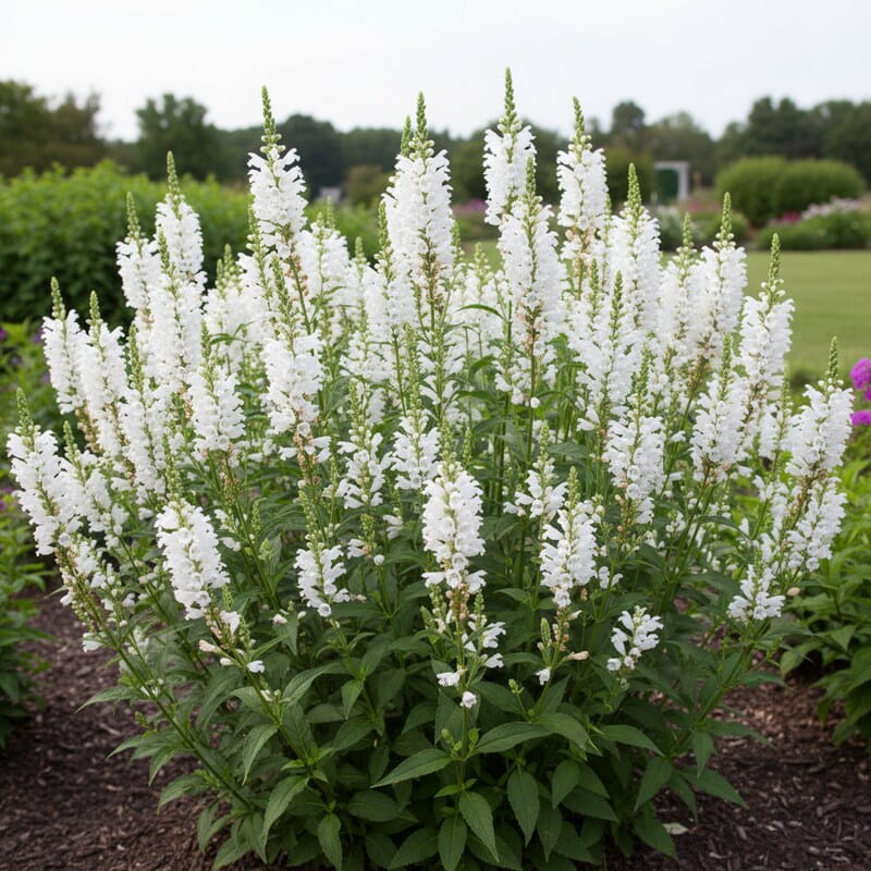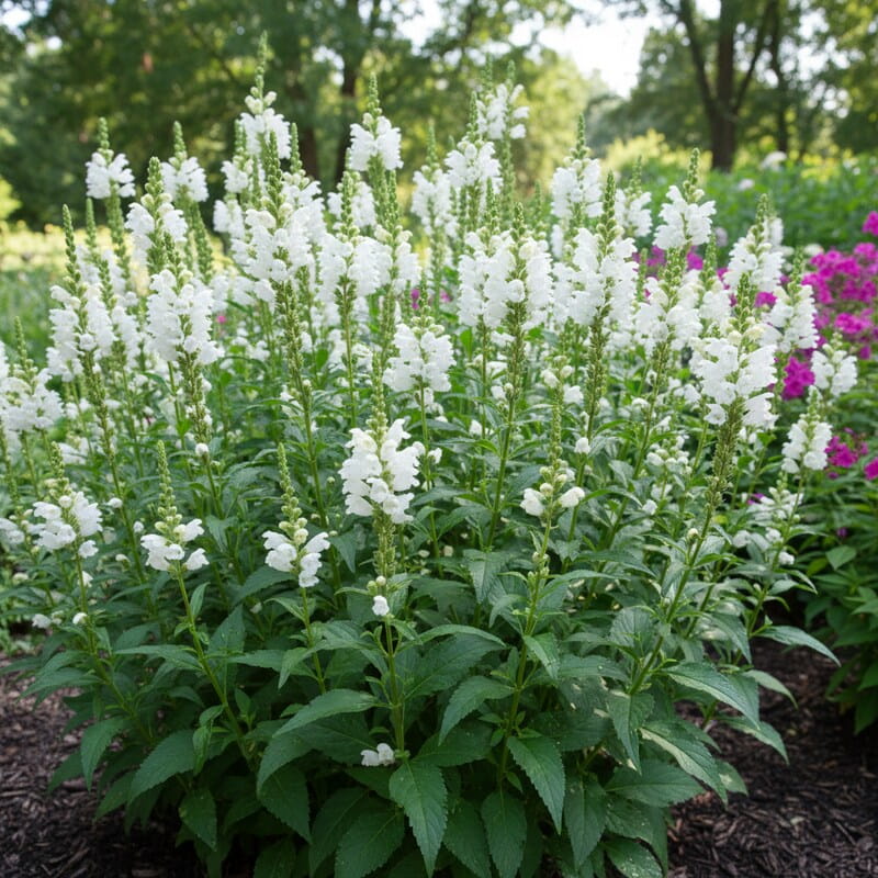 Odętka wirginijska ‘Summer Snow’ (Physostegia virginiana) to elegancka, wyprostowana bylina, która od lipca do września obsypuje się śnieżnobiałymi kwiatami. Zebrane w smukłe, pionowe kłosy, wyglądają jak jasne świece unoszące się nad zieloną rabatą. Dorasta do około 70–90 cm wysokości, dzięki czemu pięknie wypełnia środek lub tył kompozycji. Kwitnie długo i obficie, a jej kwiaty świetnie nadają się także do wazonu. To roślina, która wnosi lekkość i świeżość do letnich rabat oraz daje długi, jasny akcent aż do końca lata, gdy wiele innych bylin już traci formę.