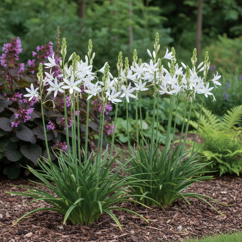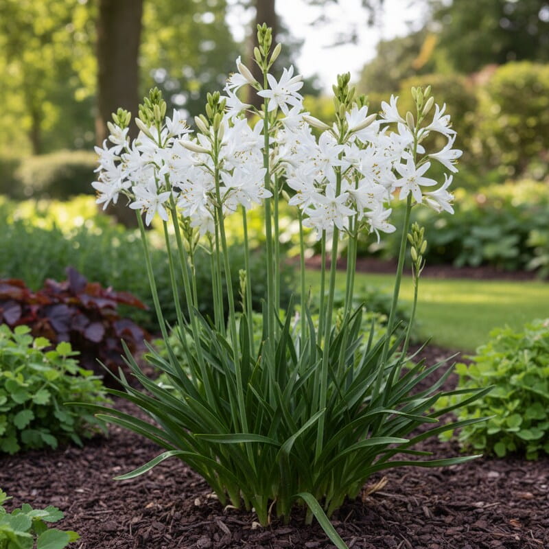 Paradyzja liliowata ‘Major’ to roślina, która wygląda jak wyjęta z górskiej łąki – smukła, jasna i pełna wdzięku. Z jej zielonych kęp wiosną wyrastają wysokie, eleganckie pędy zakończone śnieżnobiałymi, gwiazdkowymi kwiatami. Całość sprawia lekkie, eteryczne wrażenie, jakby delikatnie unosiła się nad rabatą. To odmiana większa i bardziej okazała niż standardowa, dlatego robi mocne wrażenie już z daleka. Warto ją posadzić, jeśli marzysz o czystej, jasnej plamie koloru i roślinie, która wygląda wyjątkowo naturalnie.