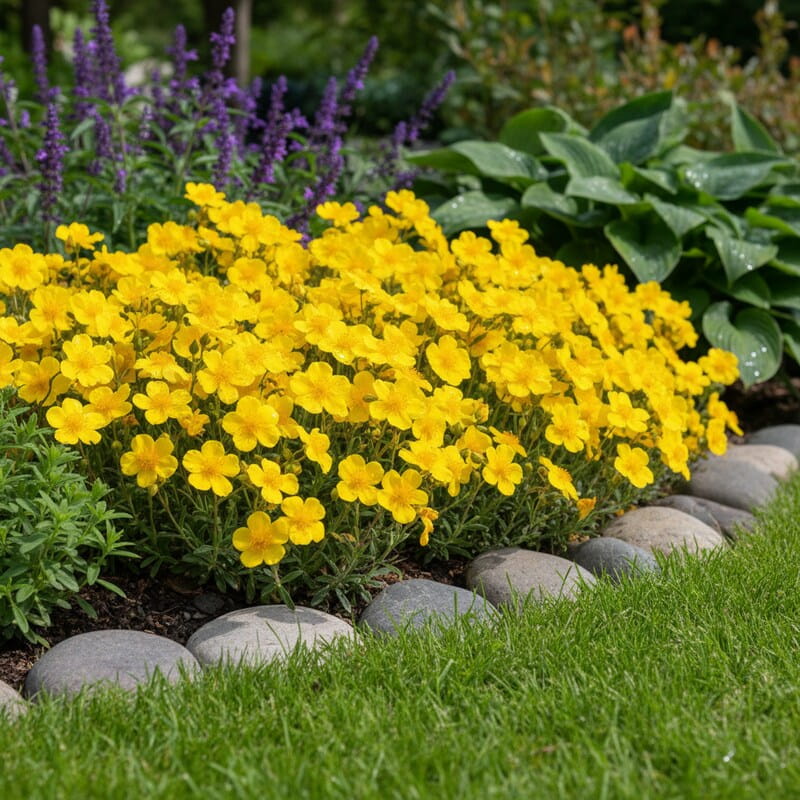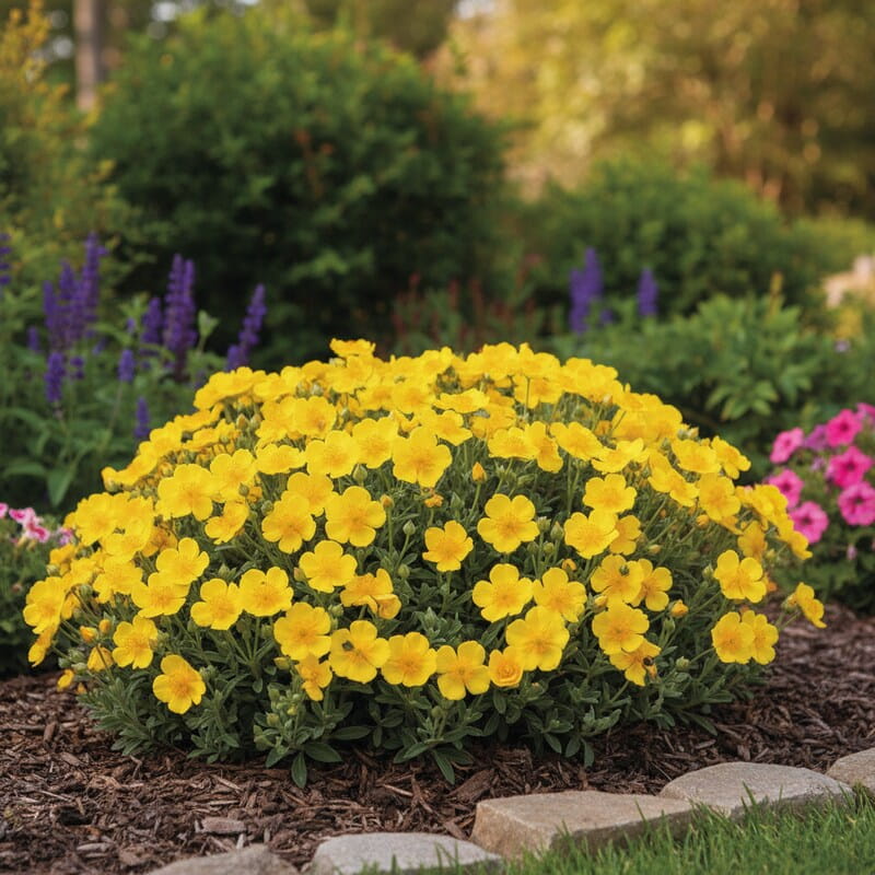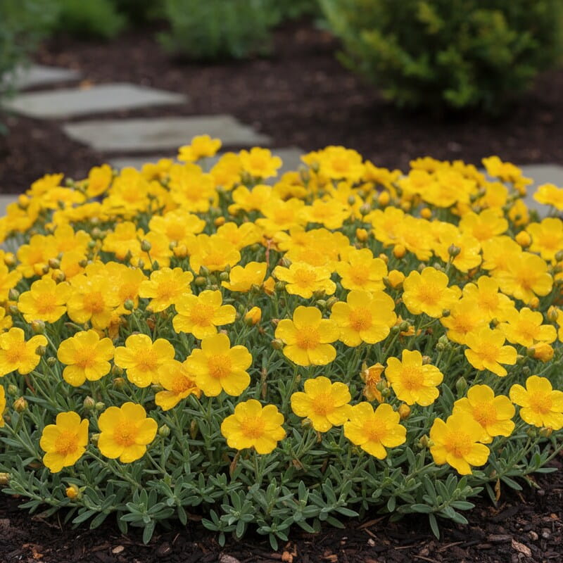 Posłonek rozesłany ‘Queen Golden’ (Helianthemum nummularium) to niska, słoneczna bylina, która w maju i czerwcu zamienia rabatę w złotą plamę koloru. Jego intensywnie żółte, lekko połyskujące kwiaty przypominają małe różyczki i pojawiają się w ogromnej ilości nad zwartą, rozłożystą kępą. Roślina dorasta do około 15–20 cm wysokości, ale potrafi rozrastać się wszerz, tworząc gęsty kobierzec. Kwitnienie jest bardzo obfite – w pełnym słońcu niemal przykrywa liście. To idealny wybór, jeśli marzysz o złotym dywanie kwiatów w ogrodzie skalnym i roślinie, która zapewni mocny efekt przy minimalnej pielęgnacji.