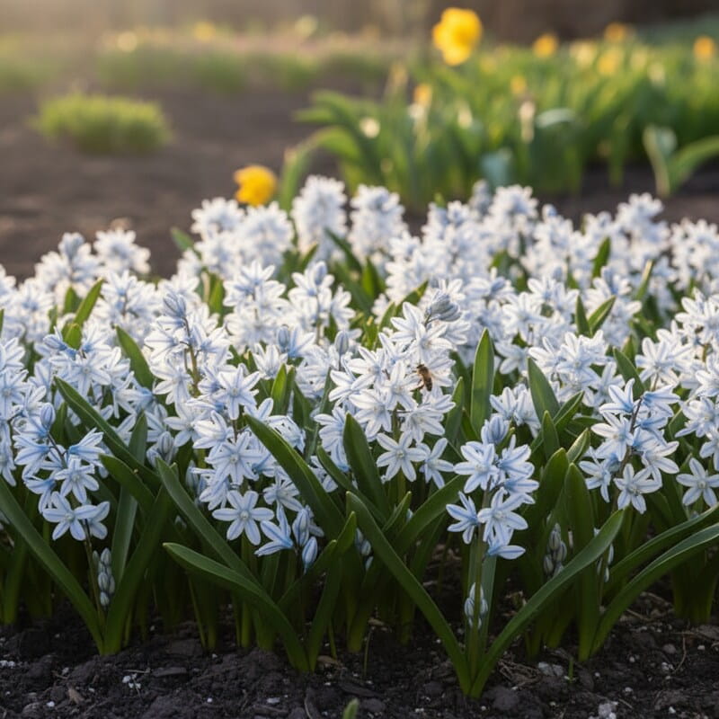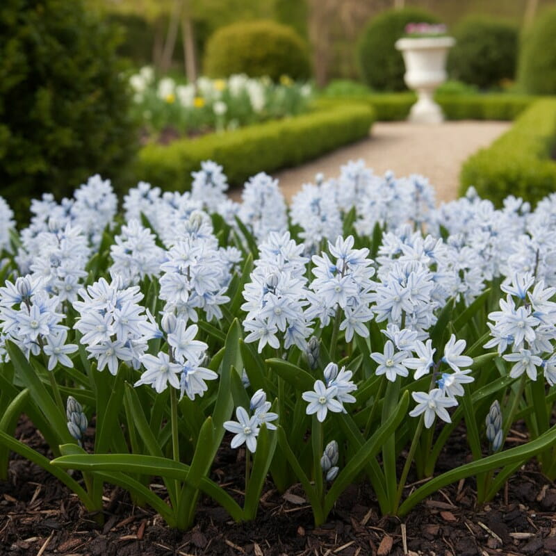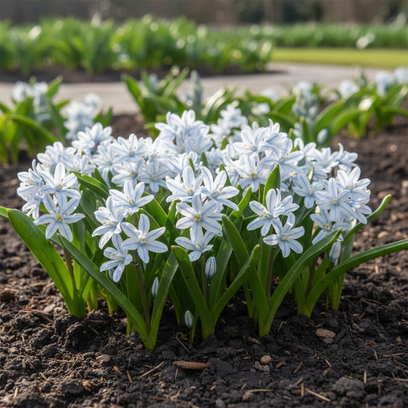 Puszkinia cebulicowa (Puschkinia scilloides) to drobna, wiosenna perełka, która pojawia się wtedy, gdy ogród dopiero się budzi. Kwitnie zazwyczaj w marcu i kwietniu, wypuszczając smukłe łodyżki z jasnoniebieskimi lub białawymi kwiatami, ozdobionymi delikatnym, niebieskim paseczkiem pośrodku płatków. Kwiatki są małe, ale w grupie dają efekt jak rozsypane konfetti – lekko, świeżo i bardzo naturalnie. Roślina dorasta najczęściej do około 10–15 cm, więc idealnie nadaje się na przód rabaty, do ogródka skalnego albo pod drzewa i krzewy. To świetny wybór, jeśli chcesz wczesnej wiosny pełnej koloru i rośliny, która nie wymaga codziennej uwagi. Raz posadzona, potrafi wracać co roku i powoli tworzyć większe kępki.