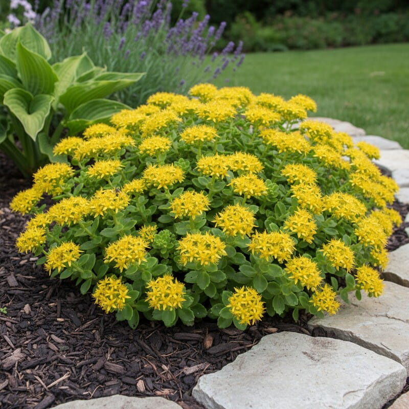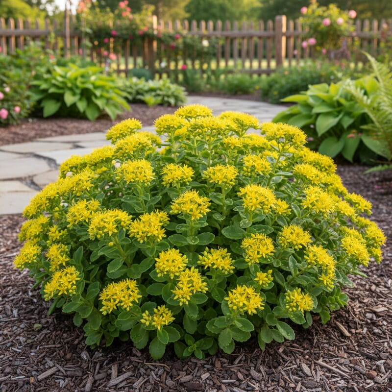 Rozchodnik kamczacki (Sedum kamtschaticum) to niska, bardzo wdzięczna roślina okrywowa, idealna dla zabieganych. Tworzy gęste, rozrastające się kępki mięsistych, zielonych liści, które ładnie wypełniają przestrzeń między kamieniami i na obrzeżach rabat. Kwitnie zwykle od czerwca do sierpnia, pokazując płaskie kwiatostany w intensywnie żółtym kolorze, które przyciągają pszczoły i inne zapylacze. Roślina dorasta najczęściej do około 10–20 cm wysokości, ale potrafi rozrastać się znacznie wszerz, tworząc niski „dywan”. Jesienią liście mogą lekko przebarwiać się na cieplejsze tony, co dodaje jej uroku. To świetny wybór, jeśli chcesz rośliny odpornej na suszę i słońce oraz szybkiego, niskiego wypełnienia rabaty.