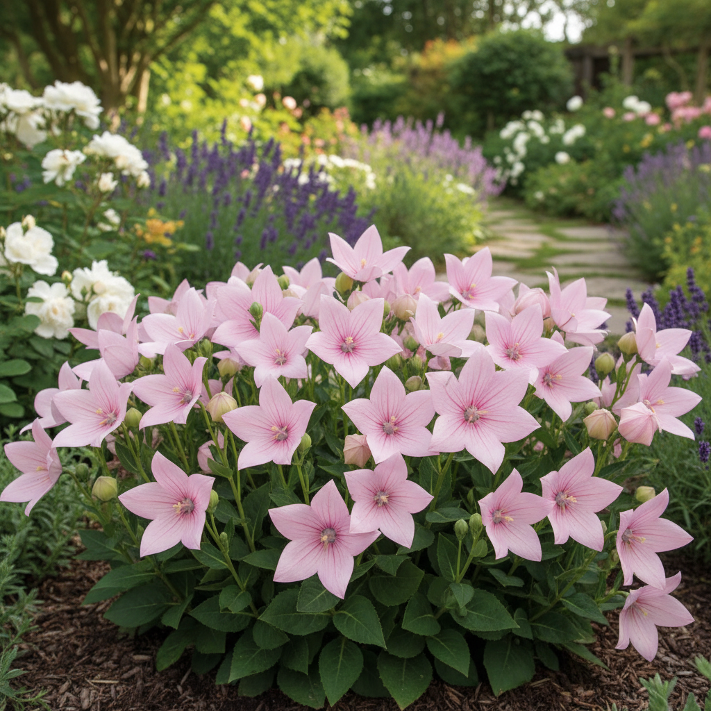 Rozwar wielkokwiatowy 'Astra Rose' (Platycodon grandiflorus) to kompaktowa odmiana rozwaru, która zachwyca eleganckim, różowym kwitnieniem. Dorasta do około 20–25 cm wysokości, tworząc niskie, zwarte kępy. Od czerwca do sierpnia obsypuje się dużymi, dzwonkowatymi kwiatami w delikatnym odcieniu różu, które pięknie kontrastują z zielonym ulistnieniem. Pąki kwiatowe przed rozwinięciem przypominają małe baloniki, co dodatkowo dodaje roślinie uroku.