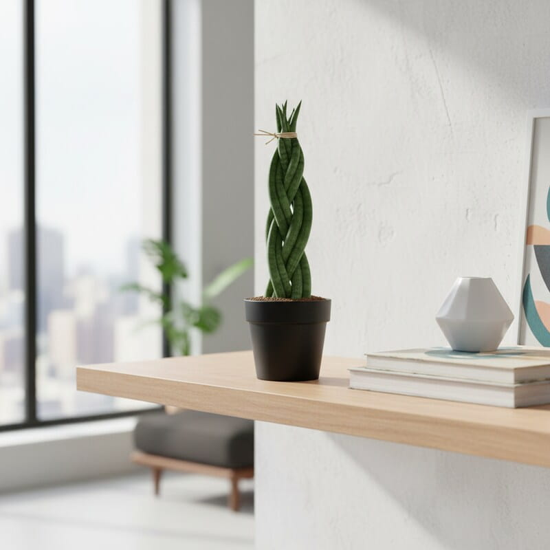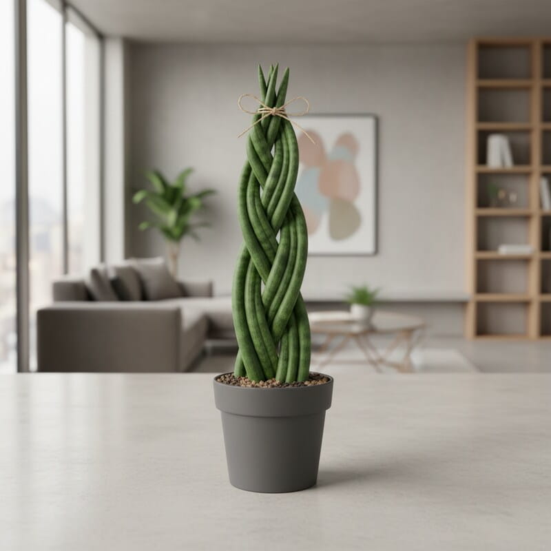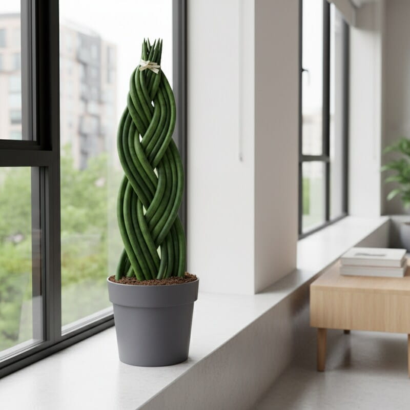 Sansewieria pleciona (Sansevieria) to efektowna forma, w której długie liście są zaplecione w dekoracyjny warkocz. Tworzy unikalny wygląd przypominający zielony, żywy splot o rzeźbiarskim charakterze, który przyciąga uwagę od razu po wejściu do pomieszczenia. Liście są sztywne, ciemnozielone i bardzo trwałe. Roślina zajmuje niewiele miejsca, a jednocześnie wygląda niezwykle oryginalnie. To roślina, która daje designerski efekt bez wysiłku.