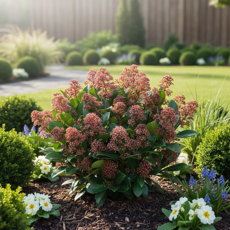 Skimia japońska ‘Rubella’ to elegancki, zimozielony krzew o ciemnozielonych, błyszczących liściach i dekoracyjnych, czerwonych pąkach, które zdobią roślinę przez całą zimę. Wiosną rozwijają się z nich drobne, jasne kwiaty, tworząc efekt jak rozsypane perełki na tle zieleni. Ta odmiana wyróżnia się intensywnie wybarwionymi pąkami i zwartym pokrojem. Doskonale sprawdzi się w donicach, przy wejściu do domu oraz na cienistych rabatach. To roślina, która daje kolor i strukturę nawet w chłodniejszych miesiącach.