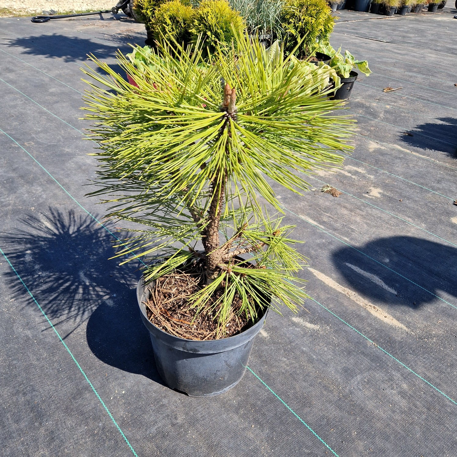 Sosna Jeffreya (Pinus jeffreyi) to wyjątkowe drzewo iglaste o długich, cienkich i często lekko skręconych igłach, które tworzą delikatne, „rozczochrane” pióropusze na końcach pędów. Jej pokrój jest luźniejszy i bardziej naturalny niż u typowych sosen, dzięki czemu wygląda bardzo swobodnie i lekko. Igły mają świeży, jasnozielony odcień, który pięknie rozświetla ogród. Nie zrzuca igieł na zimę, więc zdobi przez cały rok. To roślina, która daje unikalny, kolekcjonerski efekt i naturalny charakter.