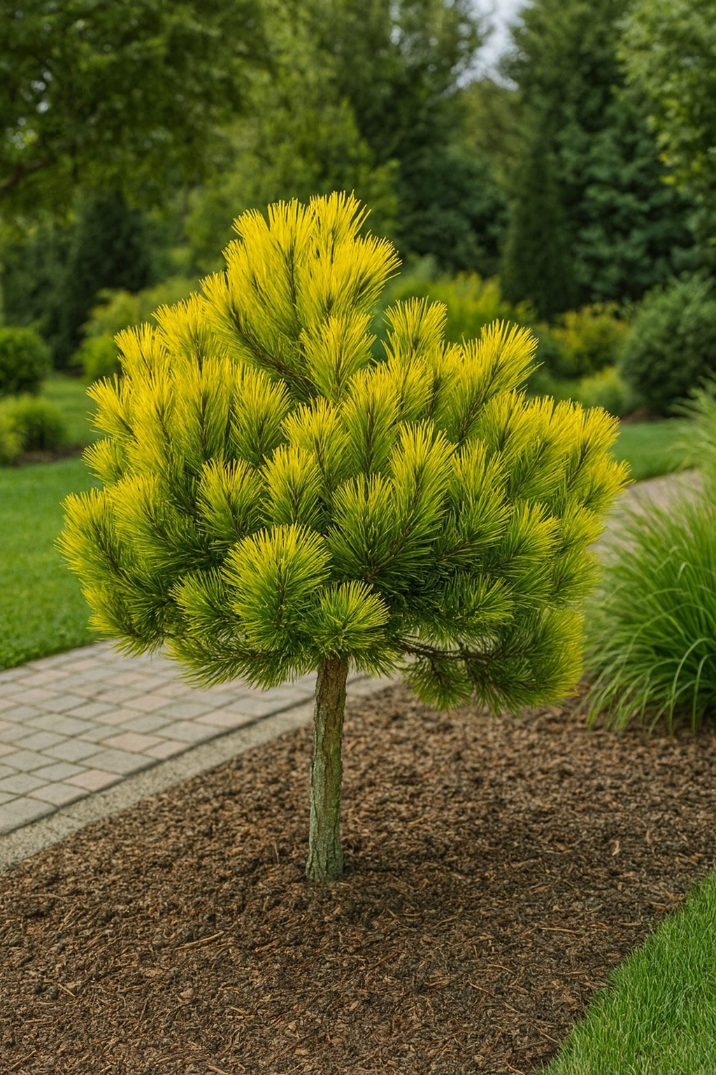 Sosna górska 'Carsten's Wintergold' (Pinus mugo) szczepiona na pniu to kompaktowa, gęsta odmiana o kulistym pokroju i wyjątkowo dekoracyjnym wybarwieniu igieł. Latem igły są soczyście zielone, ale zimą zaskakują intensywnym, złocistożółtym kolorem, który pięknie rozświetla ogród w chłodniejszych miesiącach. Szczepiona na pniu, tworzy efektowną, „drzewkowatą” formę, która doskonale nadaje się do małych ogrodów, na rabaty, skalniaki, a także do uprawy w donicach. Roślina rośnie powoli – po 10 latach osiąga około 60–80 cm średnicy korony.