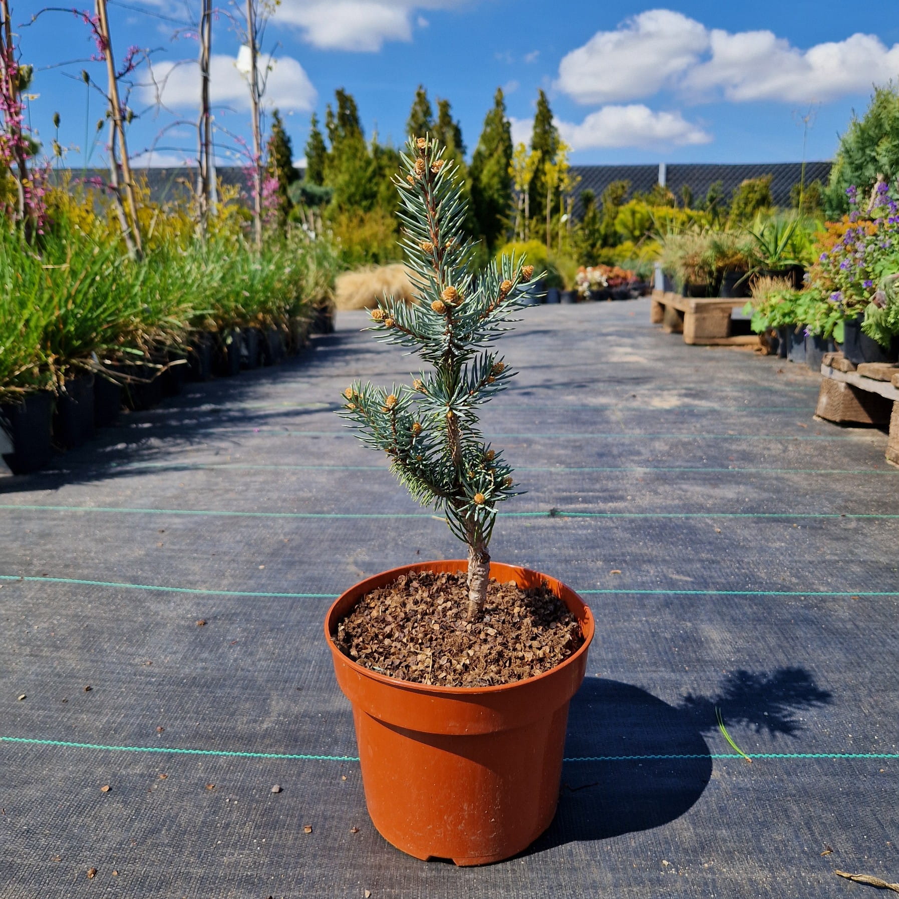 Świerk kłujący ‘Iseli Fastigiate’ (Picea pungens) to wąska, kolumnowa odmiana o eleganckim, strzelistym pokroju. Jego sztywne, srebrzysto-niebieskie igły tworzą efekt smukłej, lodowej wieży w ogrodzie, która przyciąga wzrok przez cały rok. Rośnie pionowo, zajmując niewiele miejsca, dlatego świetnie sprawdza się nawet w mniejszych przestrzeniach. Odmiana wyróżnia się zwartą formą i intensywnym kolorem igieł. To roślina, która daje wyrazisty akcent bez zajmowania dużej powierzchni.