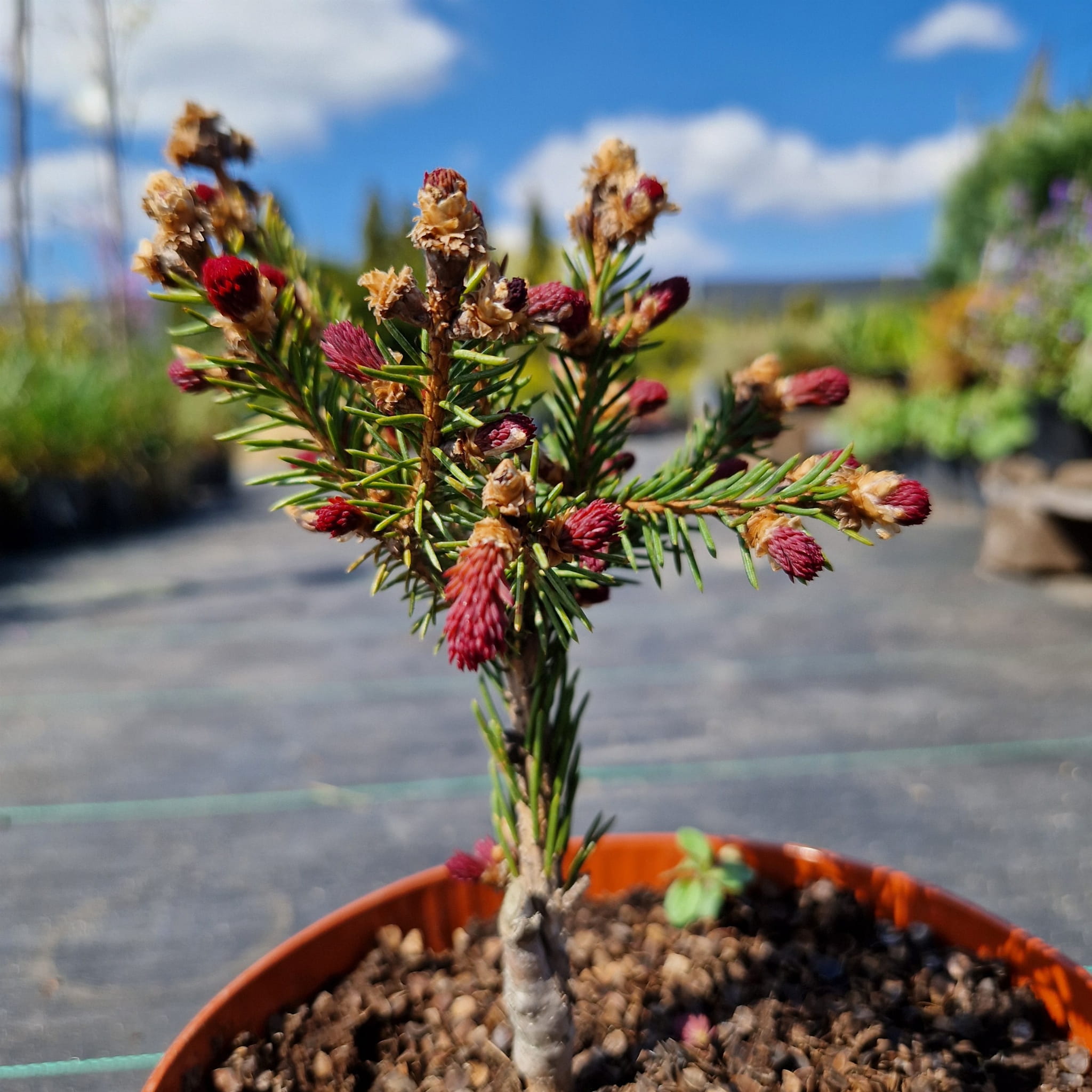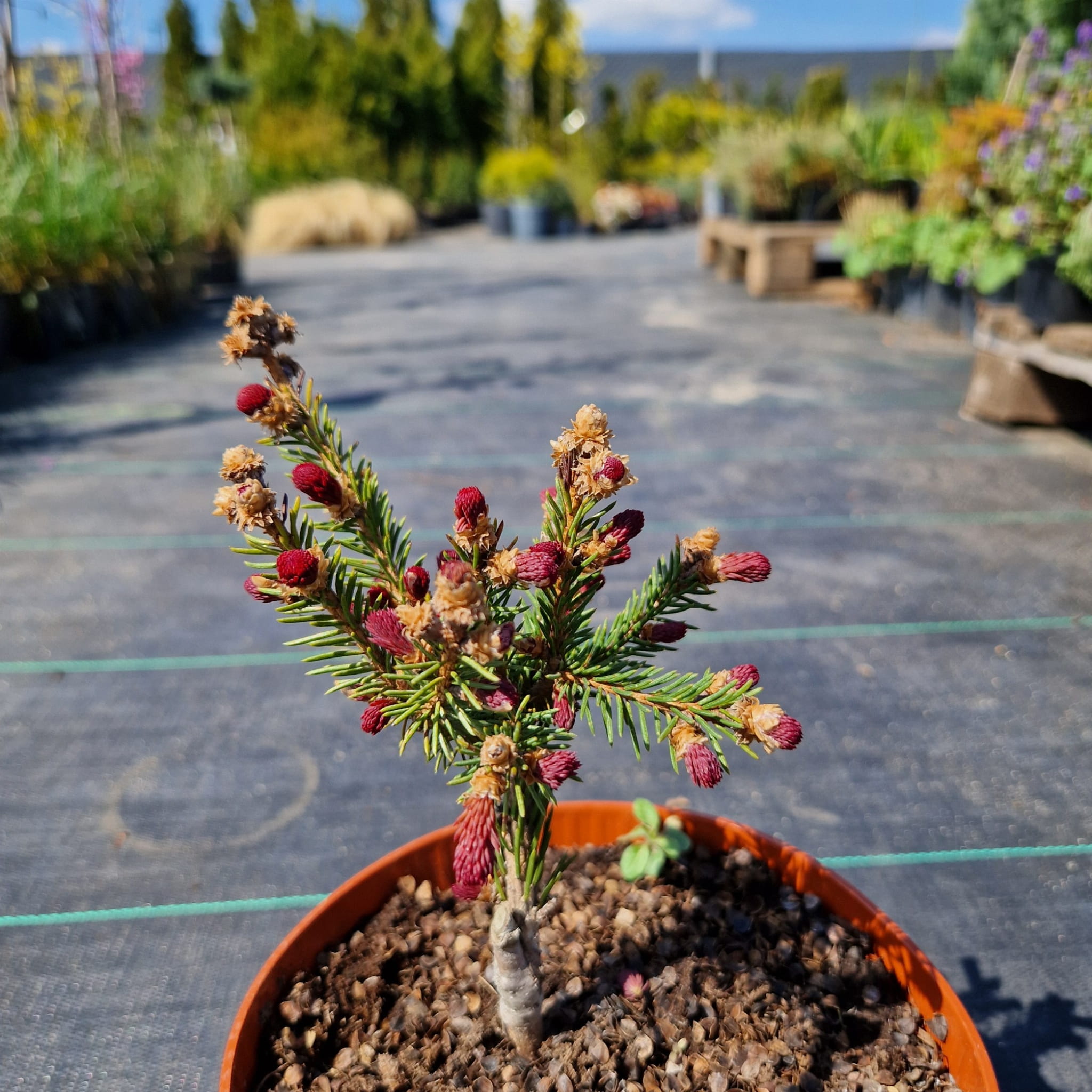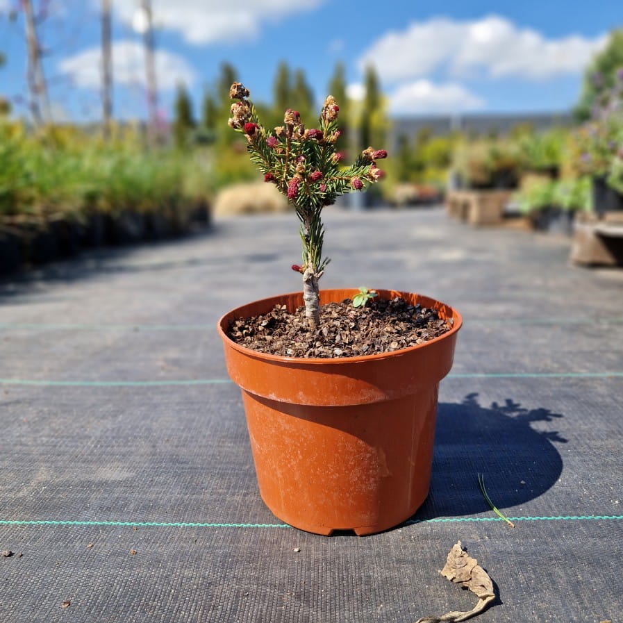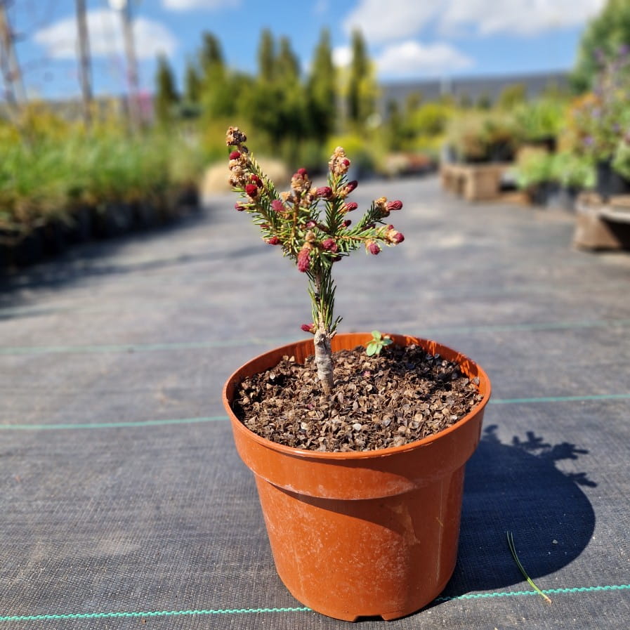 Świerk pospolity ‘Rydal’ (Picea abies) to wyjątkowa odmiana, która przyciąga uwagę młodymi przyrostami w intensywnie czerwonym kolorze. Wiosną wygląda jak drzewko muśnięte płomieniem, z czerwonymi końcówkami pędów, które z czasem przechodzą w klasyczną zieleń. Ma regularny, stożkowy pokrój i zachowuje elegancki wygląd przez cały rok, bo nie zrzuca igieł na zimę. Świetnie sprawdzi się jako soliter lub mocny akcent kolorystyczny. To roślina, która daje efekt „wow” już od pierwszych dni wiosny.