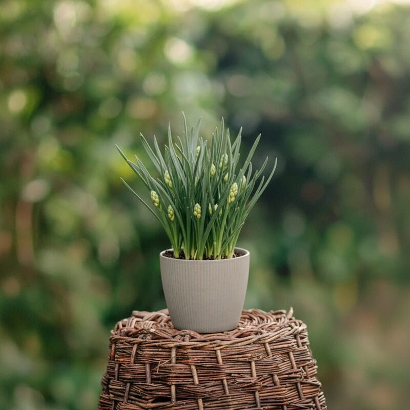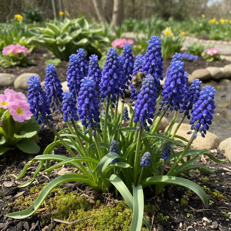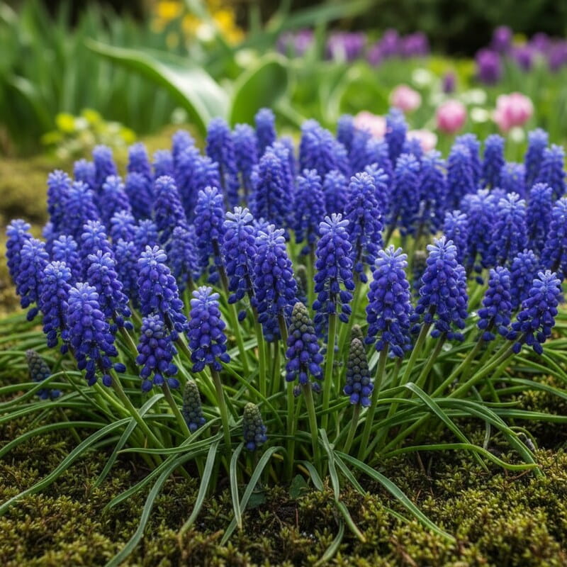 Szafirek armeński (Muscari armeniacum) to jedna z najbardziej rozpoznawalnych cebulowych roślin wiosny. Kwitnie w kwietniu i maju, tworząc gęste, kłosowate kwiatostany w intensywnym, szafirowoniebieskim kolorze. Drobne, dzwonkowate kwiaty są ciasno ułożone jeden nad drugim, jak małe koraliki. Roślina dorasta do około 15–20 cm wysokości, dlatego świetnie nadaje się na przód rabaty, do ogródka skalnego albo do sadzenia w trawniku. W większej grupie tworzy efekt niebieskiej rzeki płynącej między innymi roślinami. To niezawodna cebulowa roślina na wiosenny kolor, która z roku na rok potrafi tworzyć coraz większe, naturalne kępy.