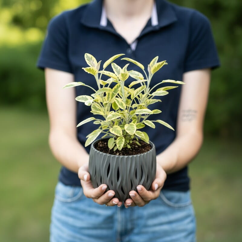 ‘Aureomaculata’ zachwyca dekoracyjnymi liśćmi, które łączą zieleń z miękkimi, złotymi plamkami. Dzięki temu roślina rozświetla rabaty nawet wtedy, gdy nie kwitnie. Latem pojawiają się delikatne, fioletowe kwiaty dodające jej lekkości, ale to liście grają tu główną rolę — wyglądają świeżo i elegancko przez cały sezon. Idealnie sprawdza się w ogrodach ziołowych, naturalnych i nowoczesnych, a w donicy tworzy bardzo efektowny akcent. To doskonały wybór, jeśli szukasz rośliny, która upiększy ogród samym kolorem liści.