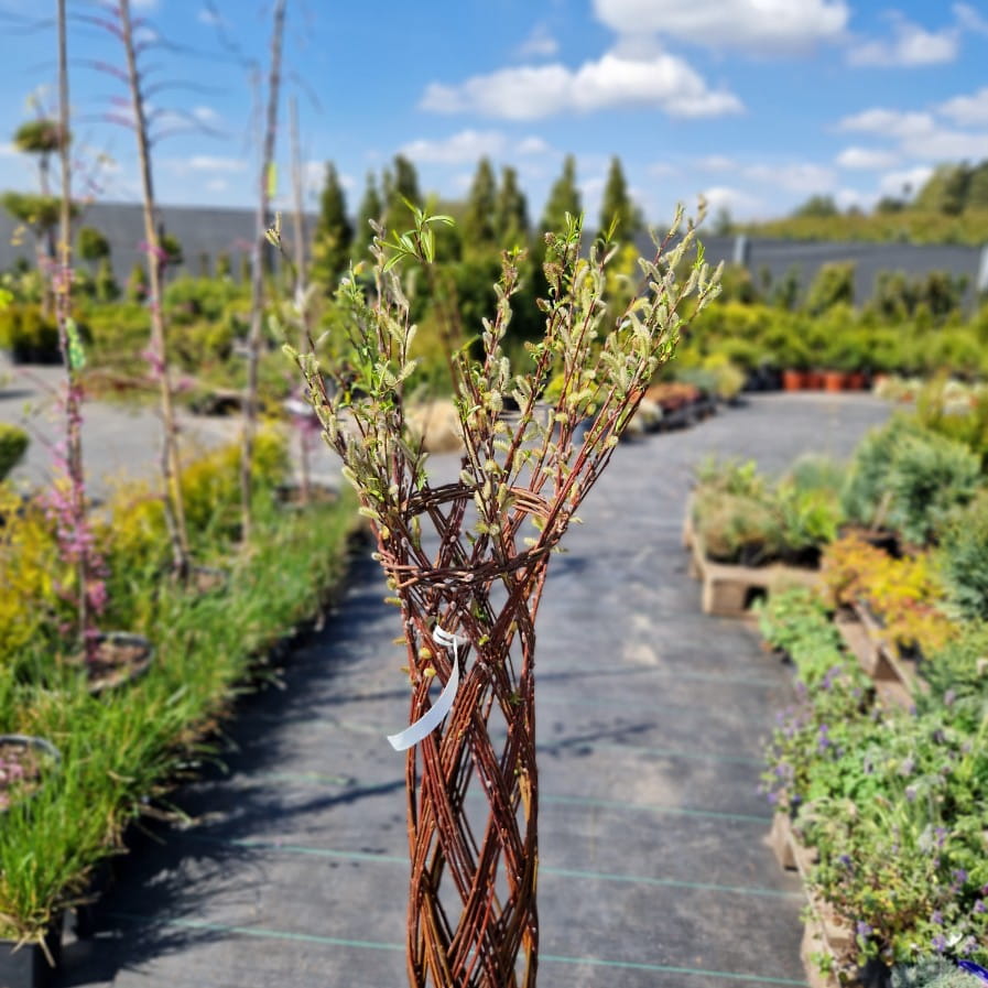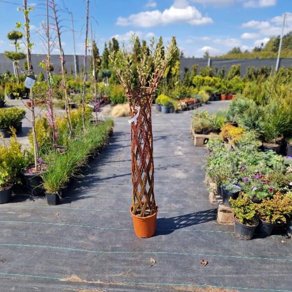 Wierzba pleciona (Salix) to wyjątkowa forma ozdobna, w której pnie są dekoracyjnie splecione, tworząc efekt żywej, naturalnej rzeźby w ogrodzie. Na szczycie rozwija się korona z wąskich, zielonych liści, która wygląda lekko i zwiewnie jak fontanna zieleni. Roślina szybko rośnie i daje natychmiastowy efekt dekoracyjny. Świetnie sprawdza się przy wejściu do domu, na tarasie lub jako soliter na rabacie. To roślina, która daje oryginalny wygląd i przyciąga spojrzenia.