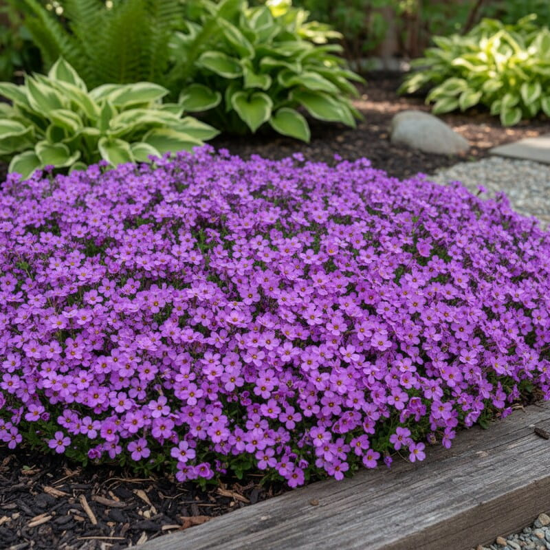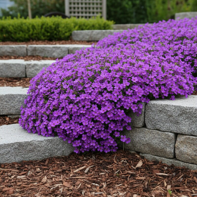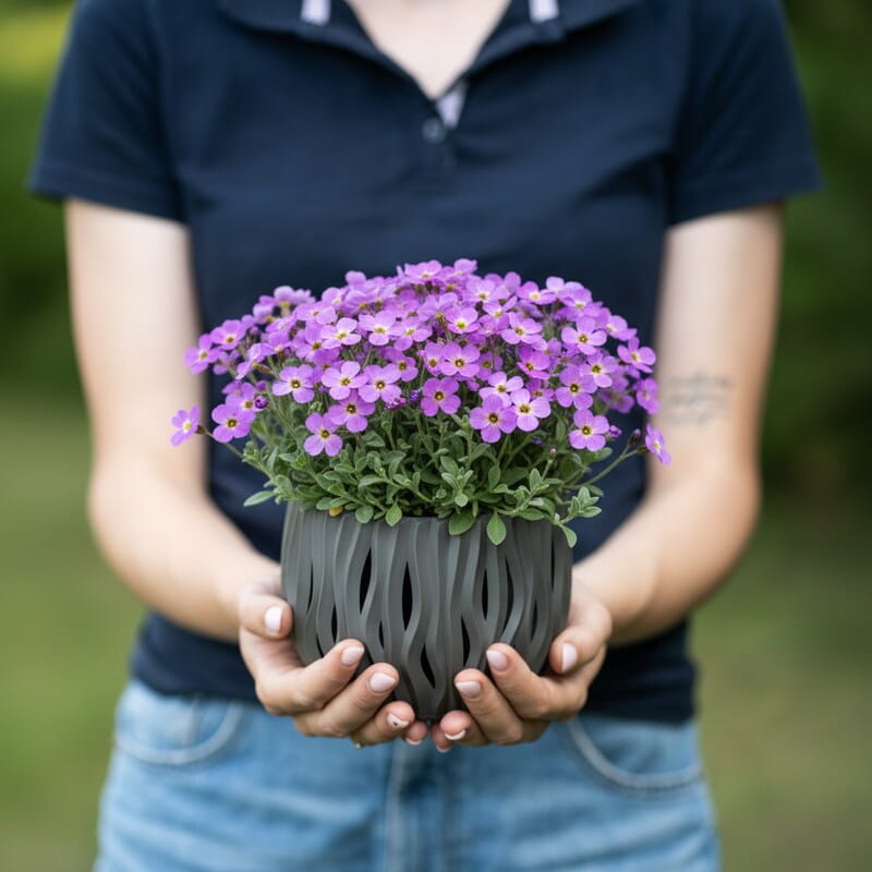 Żagwin pospolity ‘Cascade Purple’ (Aubrieta) to wiosenna eksplozja koloru w kompaktowym wydaniu. W kwietniu i maju niemal całkowicie obsypuje się drobnymi, intensywnie fioletowo-purpurowymi kwiatami, które tworzą gęstą, barwną poduchę. Dorasta do około 10–15 cm wysokości, ale szeroko rozrasta się na boki i pięknie przewiesza przez kamienie, murki czy obrzeża rabat. Zimozielone liście utrzymują się przez cały rok, dzięki czemu roślina zdobi ogród także poza sezonem kwitnienia. To idealny wybór, jeśli chcesz uzyskać wiosenny, kolorowy wodospad kwiatów i mieć efektowną roślinę do ogrodu skalnego lub na skarpę.