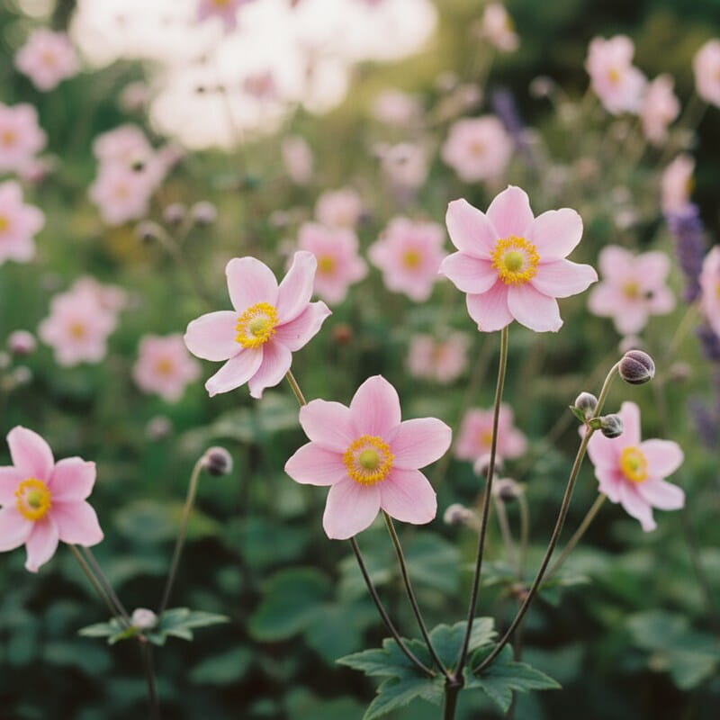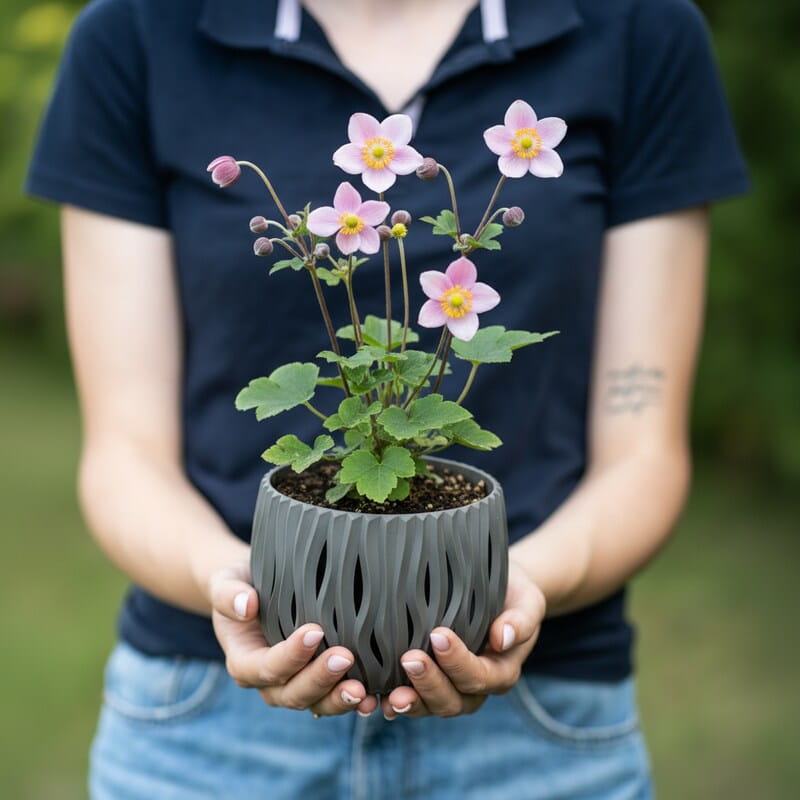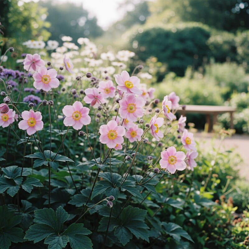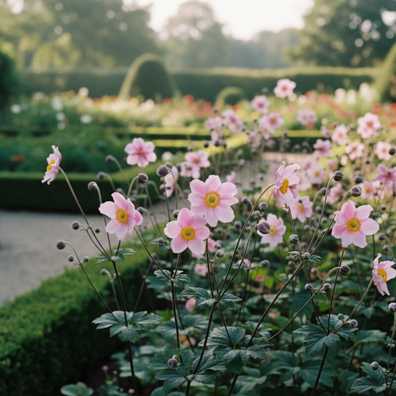 Zawilec japoński ‘Garden Breeze Whirlwind Pink’ to jesienna lekkość w najpiękniejszym wydaniu. Na smukłych łodygach pojawiają się półpełne, różowe kwiaty, które wyglądają jak małe, wirujące falbanki i pięknie poruszają się na wietrze. Gdy wiele roślin kończy sezon, on dopiero rozkręca swój pokaz, więc rabata dostaje drugie życie późnym latem i jesienią. Roślina tworzy kępę liści i z czasem potrafi zrobić większą plamę, dzięki czemu łatwo nią wypełnić półcieniste zakątki. To idealny wybór, jeśli chcesz romantyczny efekt jesienią i roślinę, która wygląda lekko, a jednocześnie robi wrażenie bez skomplikowanej pielęgnacji.